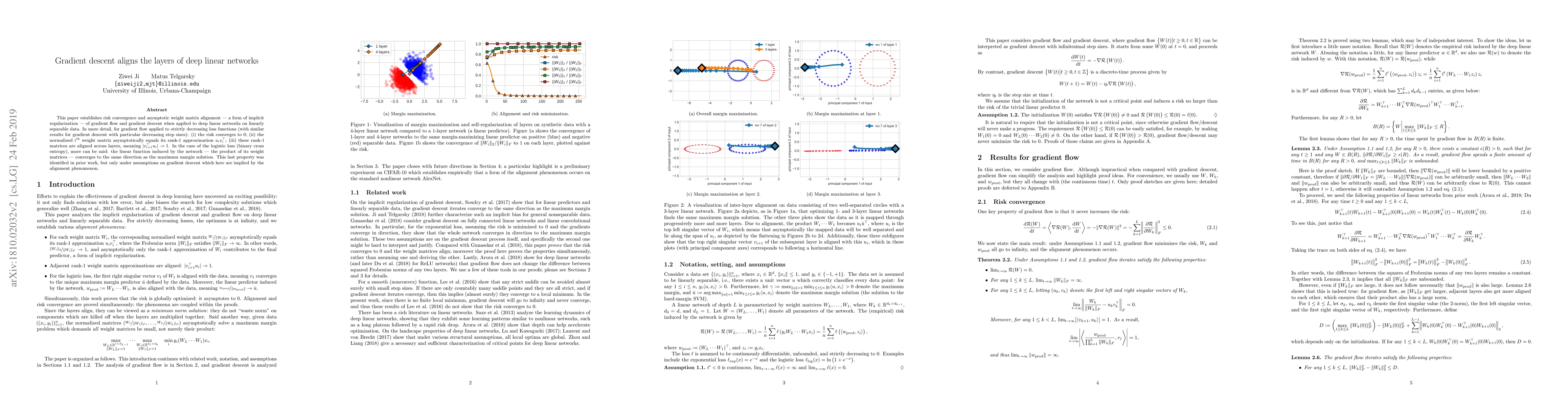 Gradient descent aligns the layers of deep linear networks, converging to a maximum margin solution for logistic loss, and exhibiting risk convergence and asymptotic weight matrix alignment.