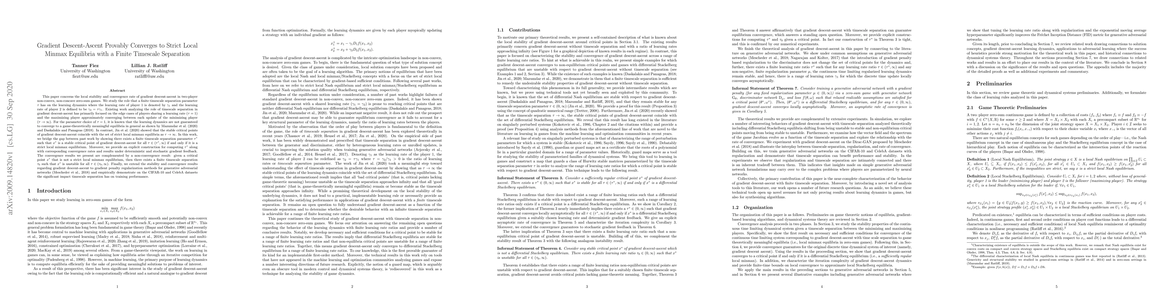 This paper investigates the impact of a finite timescale separation parameter $\tau$ on gradient descent-ascent in non-convex, non-concave zero-sum games, proving convergence to strict local minmax equilibria when $\tau$ is sufficiently large. It bridges previous studies by showing convergence to equilibria under a finite $\tau^{\ast}$, providing explicit constructions and convergence rates.