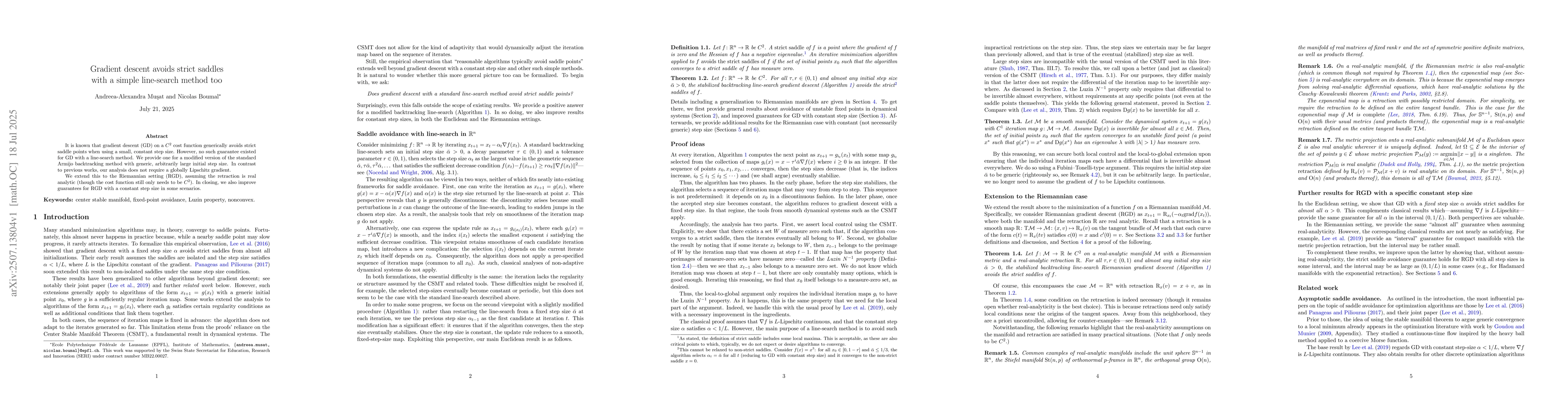 It is known that gradient descent (GD) on a $C^2$ cost function generically avoids strict saddle points when using a small, constant step size. However, no such guarantee existed for GD with a line-search method. We provide one for a modified version of the standard Armijo backtracking method with generic, arbitrarily large initial step size. In contrast to previous works, our analysis does not require a globally Lipschitz gradient. We extend this to the Riemannian setting (RGD), assuming the retraction is real analytic (though the cost function still only needs to be $C^2$). In closing, we also improve guarantees for RGD with a constant step size in some scenarios.