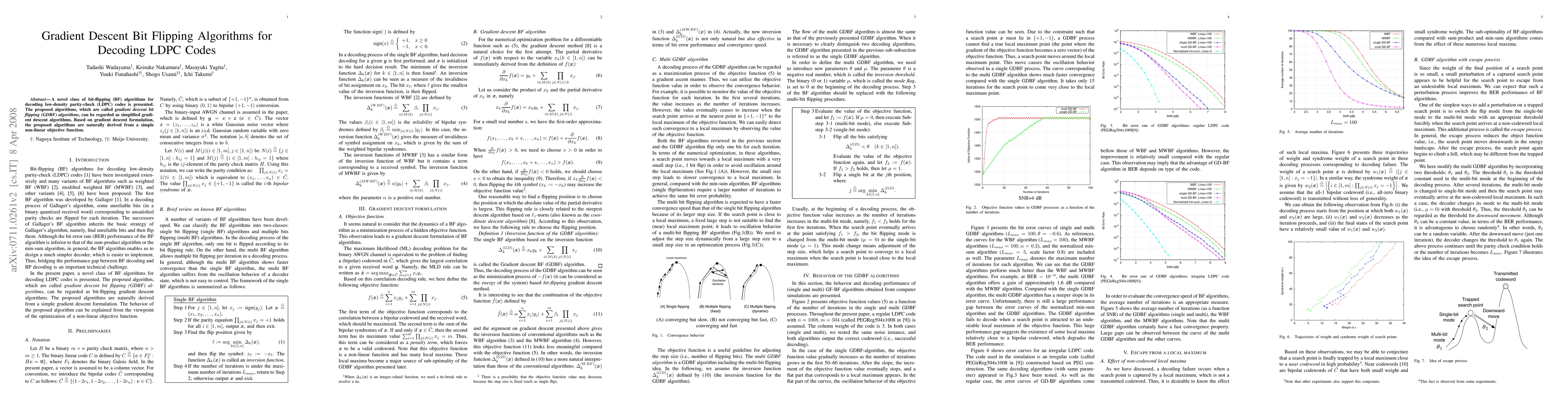 Summary: This paper introduces gradient descent bit flipping (GDBF) algorithms for decoding LDPC codes, which simplify gradient descent methods and are derived from a non-linear objective function. These algorithms aim to improve the efficiency of bit-flipping approaches in LDPC decoding.