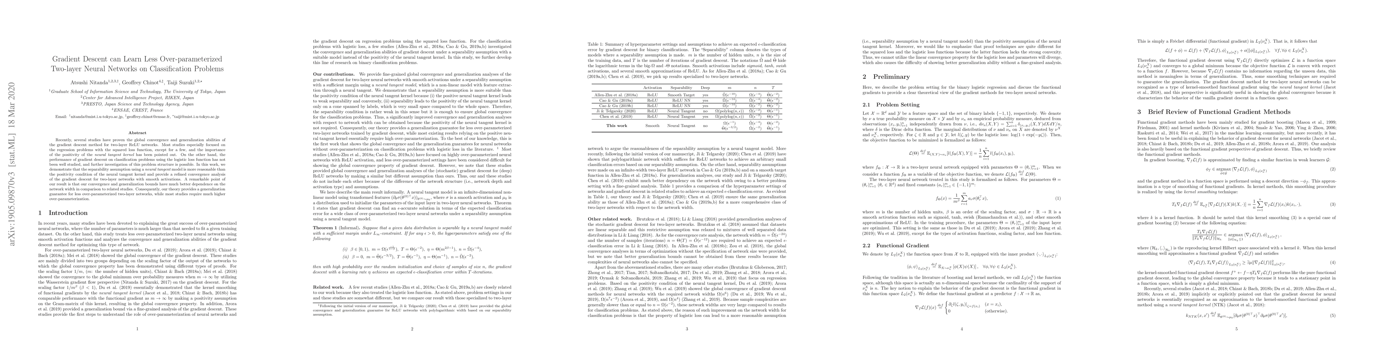 This paper investigates the performance of gradient descent on classification problems using less over-parameterized two-layer neural networks. It demonstrates that a separability assumption is more effective than the positivity condition of the neural tangent kernel, providing better convergence and generalization bounds with less network width compared to existing studies.