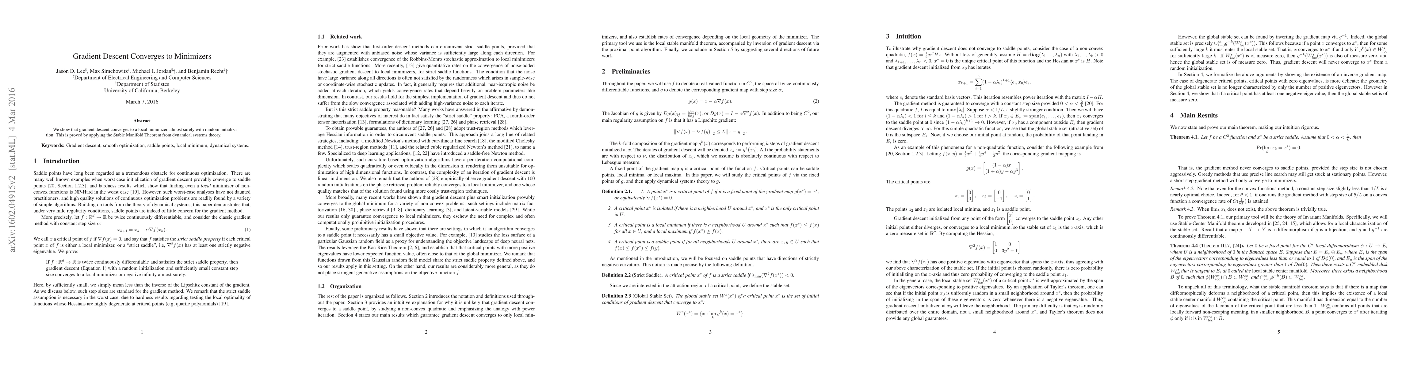 Summary: This paper demonstrates that gradient descent converges to a local minimizer almost surely with random initialization, using the Stable Manifold Theorem from dynamical systems theory to prove the convergence.