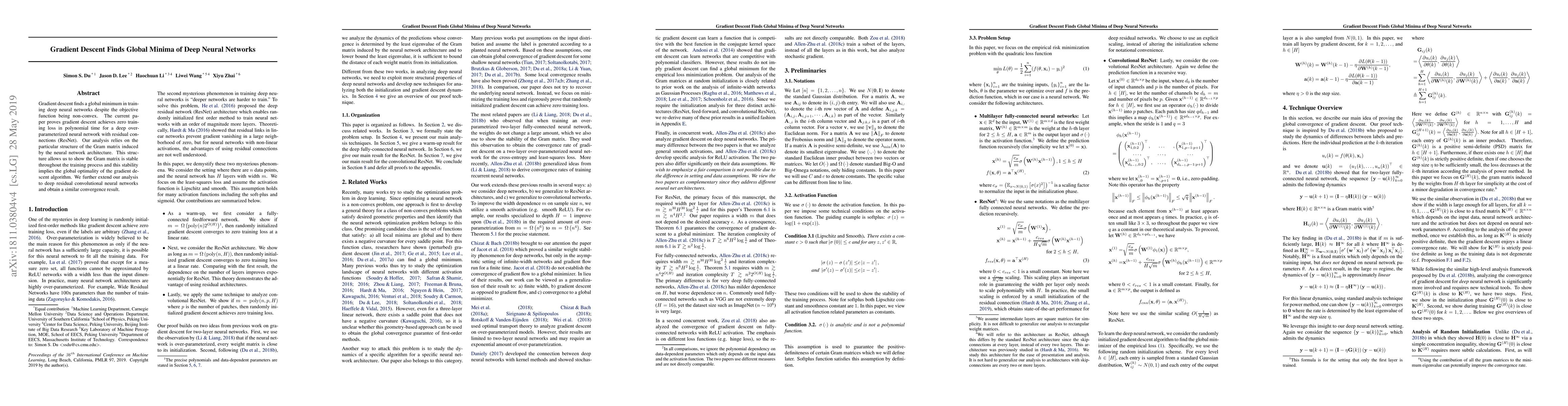 This paper proves that gradient descent can achieve zero training loss in polynomial time for deep over-parameterized neural networks with residual connections (ResNet) by analyzing the stability of the Gram matrix throughout training. The authors extend their findings to deep residual convolutional neural networks, demonstrating similar convergence results.