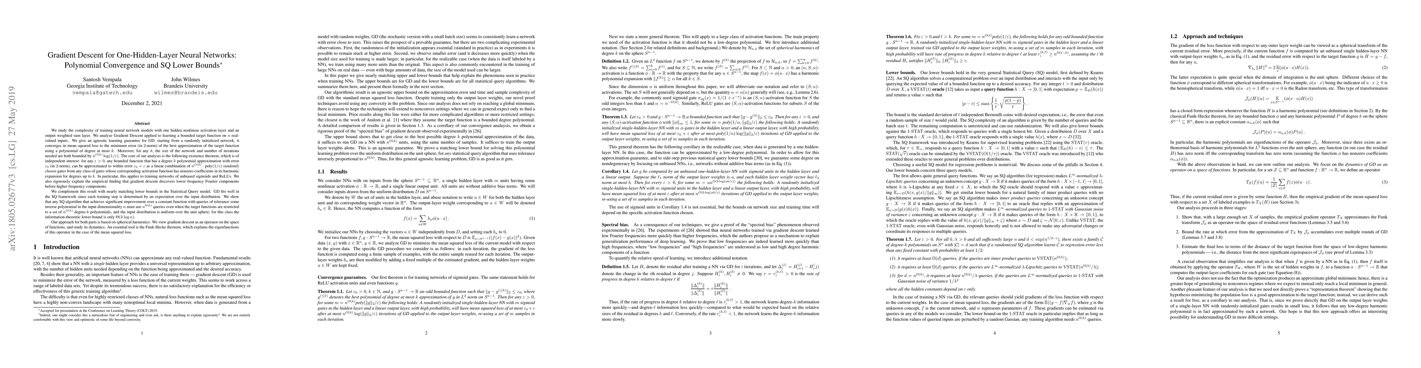 This paper investigates the convergence properties of Gradient Descent for training one-hidden-layer neural networks, proving polynomial convergence rates and establishing nearly matching Statistical Query lower bounds. It demonstrates that GD efficiently learns bounded target functions using polynomial approximations, while also showing that any SQ algorithm must use a large number of queries to achieve significant improvements.