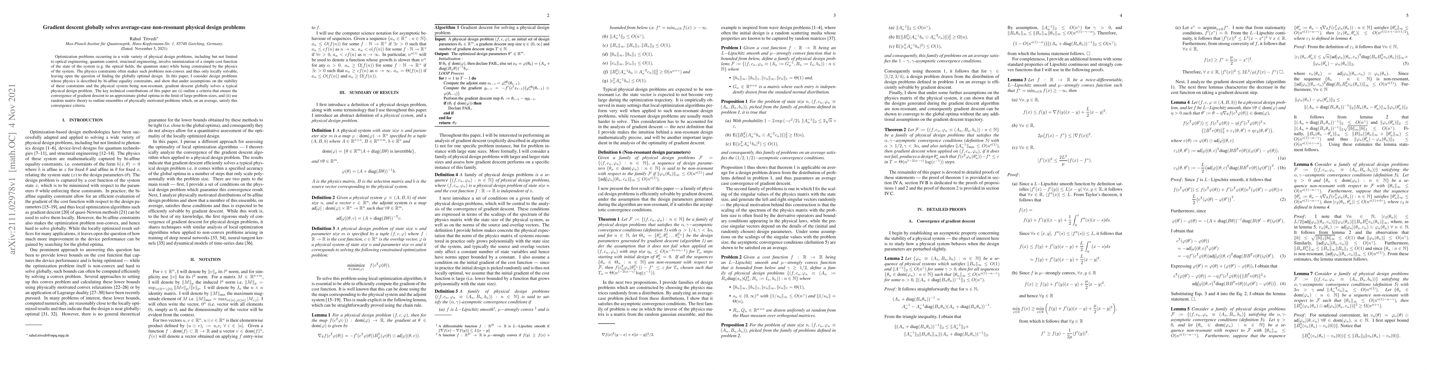 Optimization problems occurring in a wide variety of physical design problems, including but not limited to optical engineering, quantum control, structural engineering, involve minimization of a simple cost function of the state of the system (e.g. the optical fields, the quantum state) while being constrained by the physics of the system. The physics constraints often makes such problems non-convex and thus only locally solvable, leaving open the question of finding the globally optimal design. In this paper, I consider design problems whose physics is described by bi-affine equality constraints, and show that under assumptions on the stability of these constraints and the physical system being non-resonant, gradient descent globally solves a typical physical design problem. The key technical contributions of this paper are (i) outline a criteria that ensure the convergence of gradient descent to an approximate global optima in the limit of large problem sizes, and (ii) use random matrix theory to outline ensembles of physically motivated problems which, on an average, satisfy this convergence criteria.