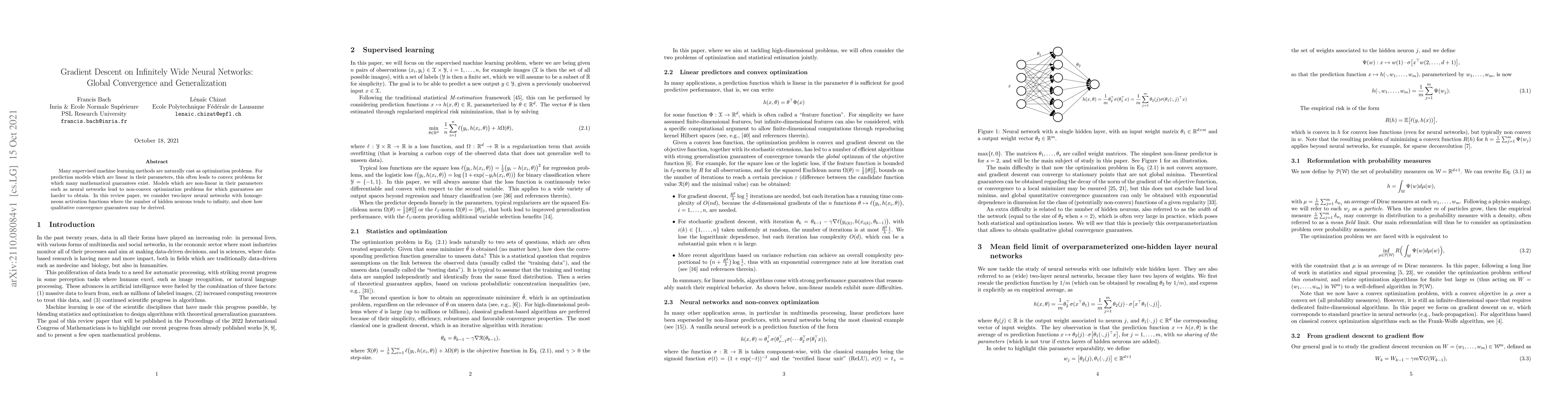 Many supervised machine learning methods are naturally cast as optimization problems. For prediction models which are linear in their parameters, this often leads to convex problems for which many mathematical guarantees exist. Models which are non-linear in their parameters such as neural networks lead to non-convex optimization problems for which guarantees are harder to obtain. In this review paper, we consider two-layer neural networks with homogeneous activation functions where the number of hidden neurons tends to infinity, and show how qualitative convergence guarantees may be derived.
