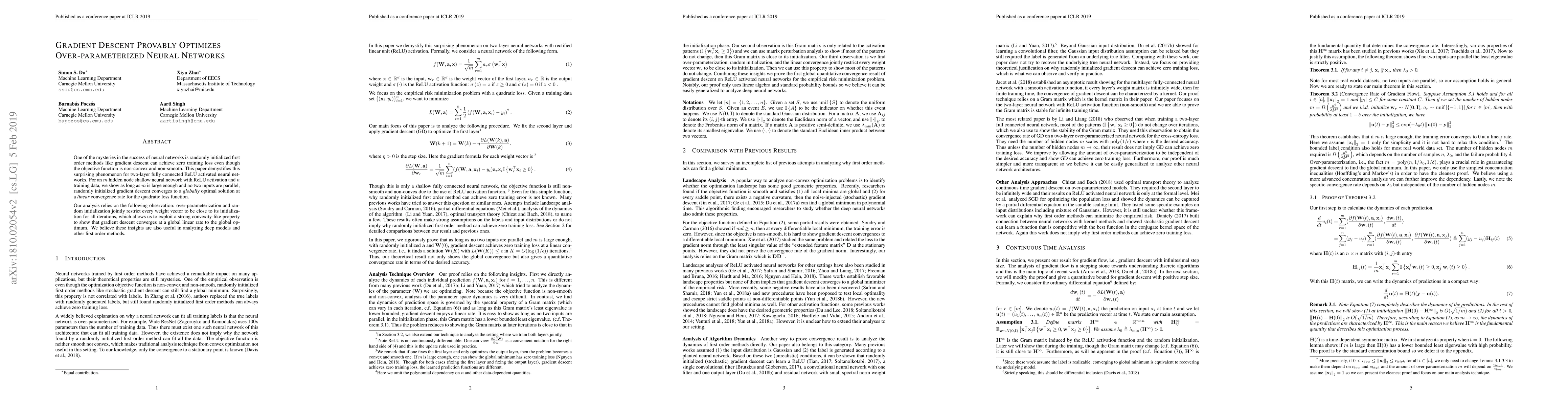 One of the mysteries in the success of neural networks is randomly initialized first order methods like gradient descent can achieve zero training loss even though the objective function is non-convex and non-smooth. This paper demystifies this surprising phenomenon for two-layer fully connected ReLU activated neural networks. For an $m$ hidden node shallow neural network with ReLU activation and $n$ training data, we show as long as $m$ is large enough and no two inputs are parallel, randomly initialized gradient descent converges to a globally optimal solution at a linear convergence rate for the quadratic loss function. Our analysis relies on the following observation: over-parameterization and random initialization jointly restrict every weight vector to be close to its initialization for all iterations, which allows us to exploit a strong convexity-like property to show that gradient descent converges at a global linear rate to the global optimum. We believe these insights are also useful in analyzing deep models and other first order methods.