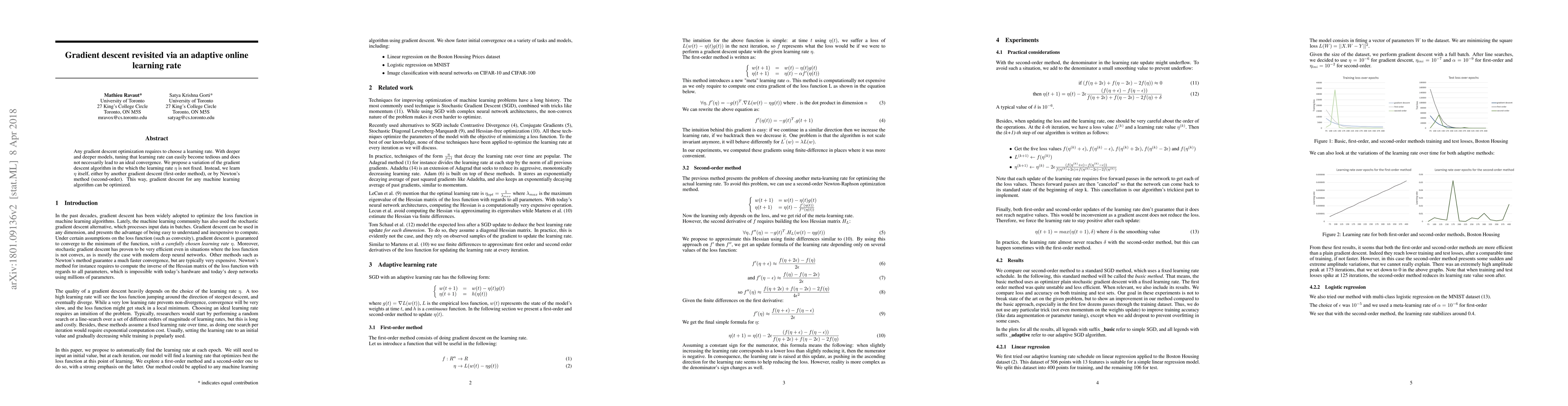 Any gradient descent optimization requires to choose a learning rate. With deeper and deeper models, tuning that learning rate can easily become tedious and does not necessarily lead to an ideal convergence. We propose a variation of the gradient descent algorithm in the which the learning rate is not fixed. Instead, we learn the learning rate itself, either by another gradient descent (first-order method), or by Newton's method (second-order). This way, gradient descent for any machine learning algorithm can be optimized.