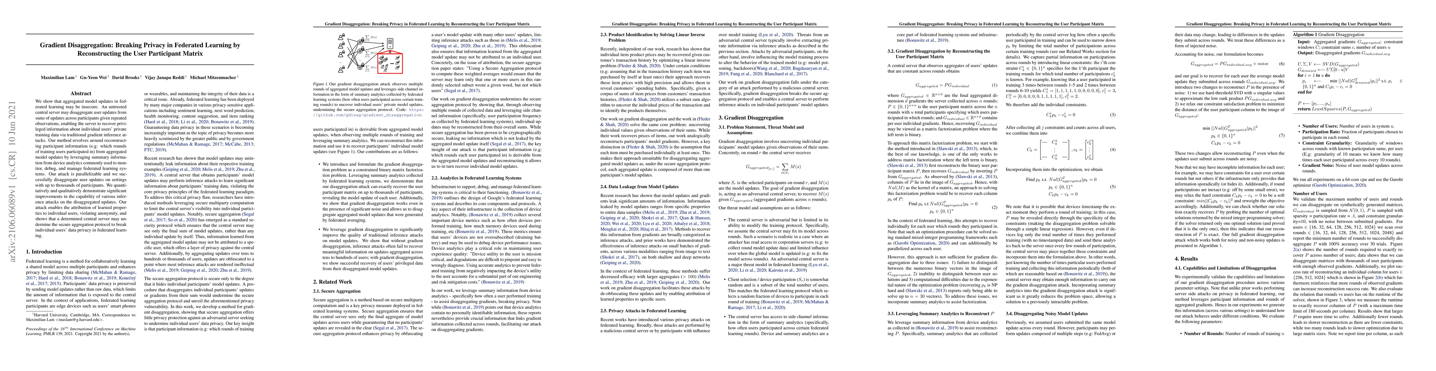 This research reveals that aggregated model updates in federated learning can be insecure, allowing an untrusted central server to disaggregate user updates and potentially recover private training data through traditional gradient inference attacks. The method reconstructs participant information using device analytics summary data, demonstrating significant improvements in inference attack capabilities, even in systems with thousands of participants, thereby undermining user data privacy.