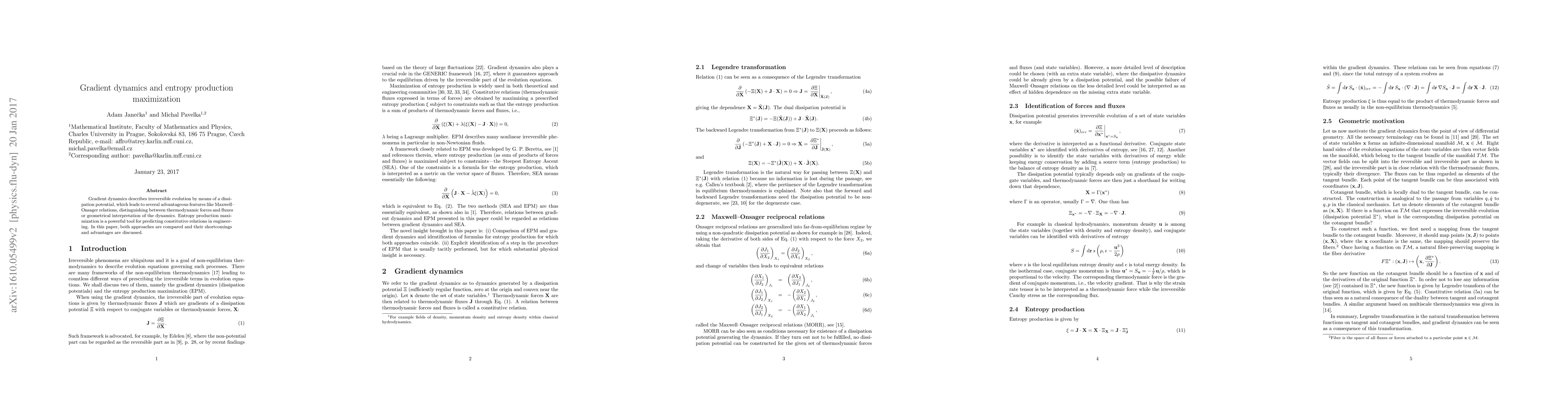 Gradient dynamics describes irreversible evolution by means of a dissipation potential, which leads to several advantageous features like Maxwell--Onsager relations, distinguishing between thermodynamic forces and fluxes or geometrical interpretation of the dynamics. Entropy production maximization is a powerful tool for predicting constitutive relations in engineering. In this paper, both approaches are compared and their shortcomings and advantages are discussed.