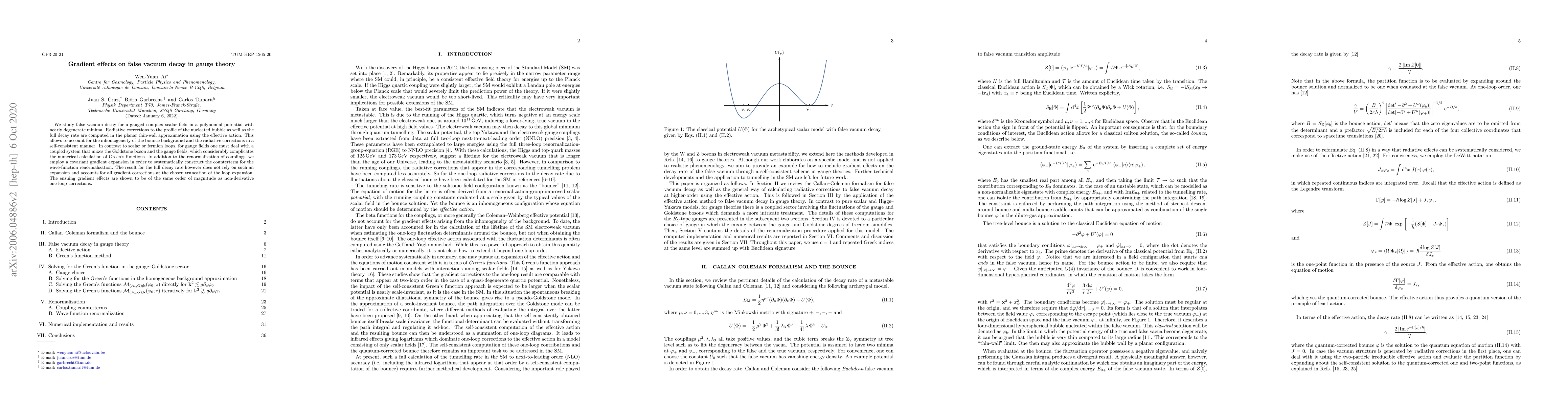 This paper investigates false vacuum decay in gauge theory for a complex scalar field with a polynomial potential, focusing on radiative corrections and gradient effects. The study employs an effective action in the planar thin-wall approximation, revealing that gradient corrections are comparable in magnitude to non-derivative one-loop corrections.