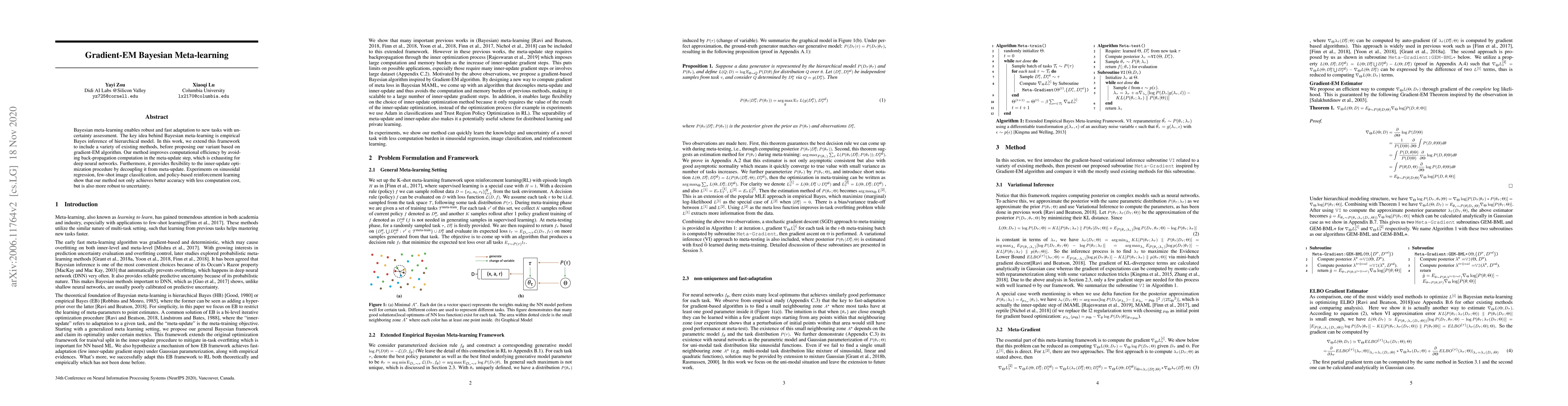 Bayesian meta-learning enables robust and fast adaptation to new tasks with uncertainty assessment. The key idea behind Bayesian meta-learning is empirical Bayes inference of hierarchical model. In this work, we extend this framework to include a variety of existing methods, before proposing our variant based on gradient-EM algorithm. Our method improves computational efficiency by avoiding back-propagation computation in the meta-update step, which is exhausting for deep neural networks. Furthermore, it provides flexibility to the inner-update optimization procedure by decoupling it from meta-update. Experiments on sinusoidal regression, few-shot image classification, and policy-based reinforcement learning show that our method not only achieves better accuracy with less computation cost, but is also more robust to uncertainty.