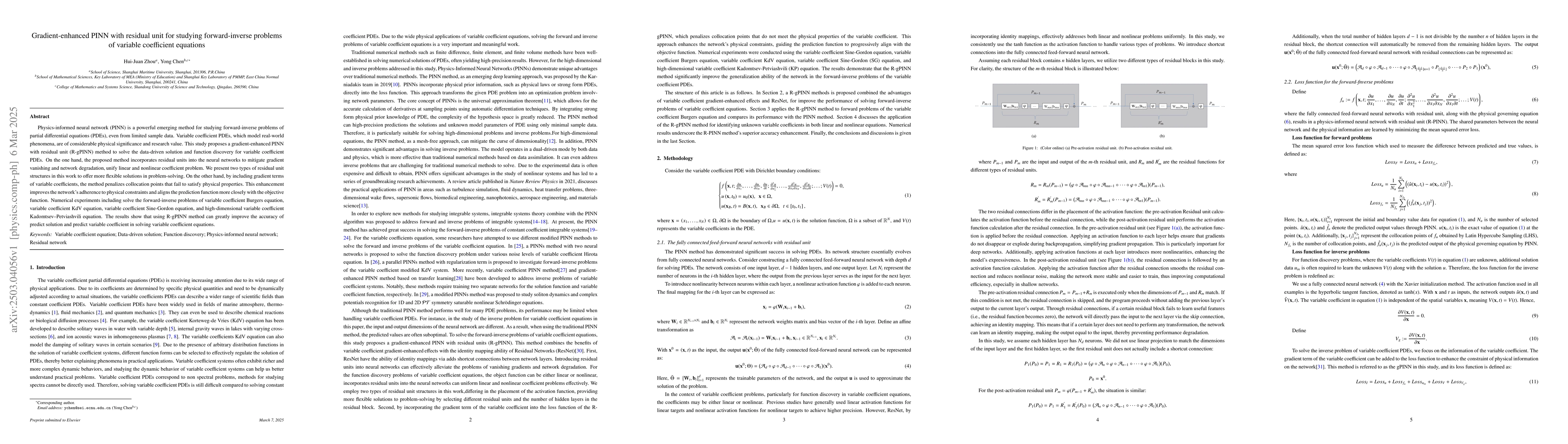 This work introduces residual units within PINNs to tackle gradient vanishing and degradation issues, enhancing the method's ability to handle variable coefficient equations effectively.