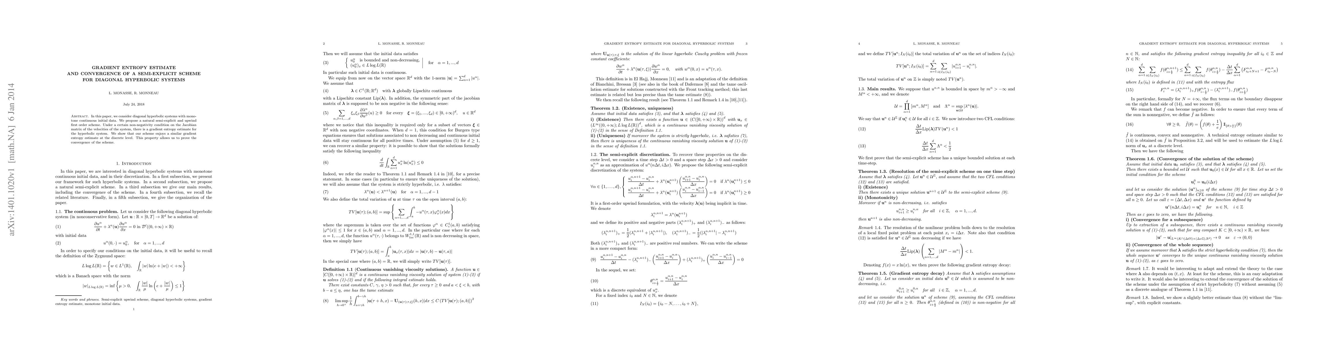 This paper proposes a semi-explicit upwind first-order scheme for diagonal hyperbolic systems with monotone initial data. It establishes a gradient entropy estimate and proves the scheme's convergence through a discrete gradient entropy estimate.
