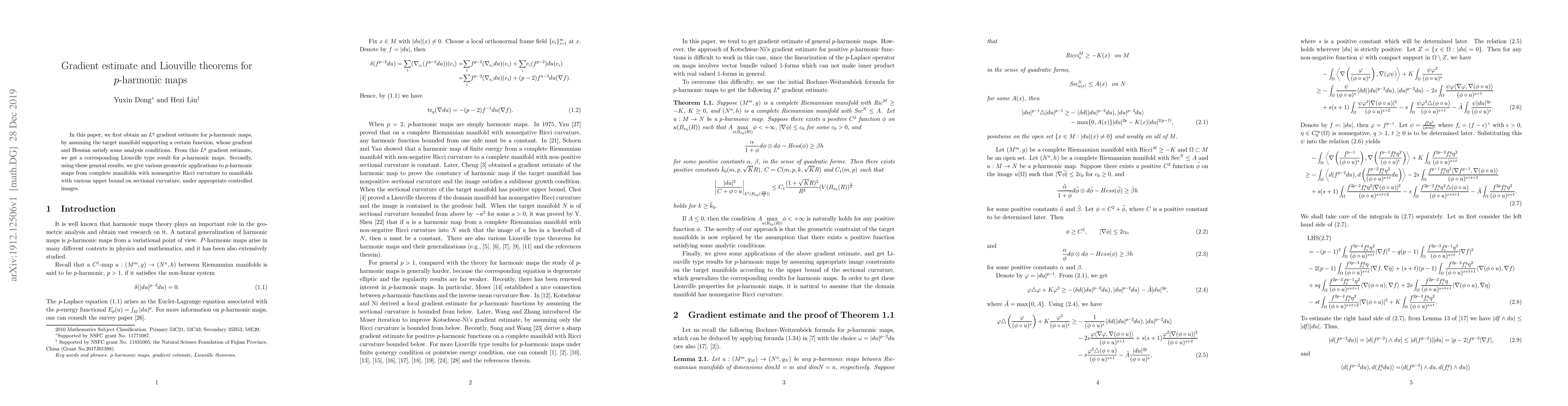In this paper, we first obtain an $L^q$ gradient estimate for $p$-harmonic maps, by assuming the target manifold supporting a certain function, whose gradient and Hessian satisfy some analysis conditions. From this $L^q$ gradient estimate, we get a corresponding Liouville type result for $p$-harmonic maps. Secondly, using these general results, we give various geometric applications to $p$-harmonic maps from complete manifolds with nonnegative Ricci curvature to manifolds with various upper bound on sectional curvature, under appropriate controlled images.