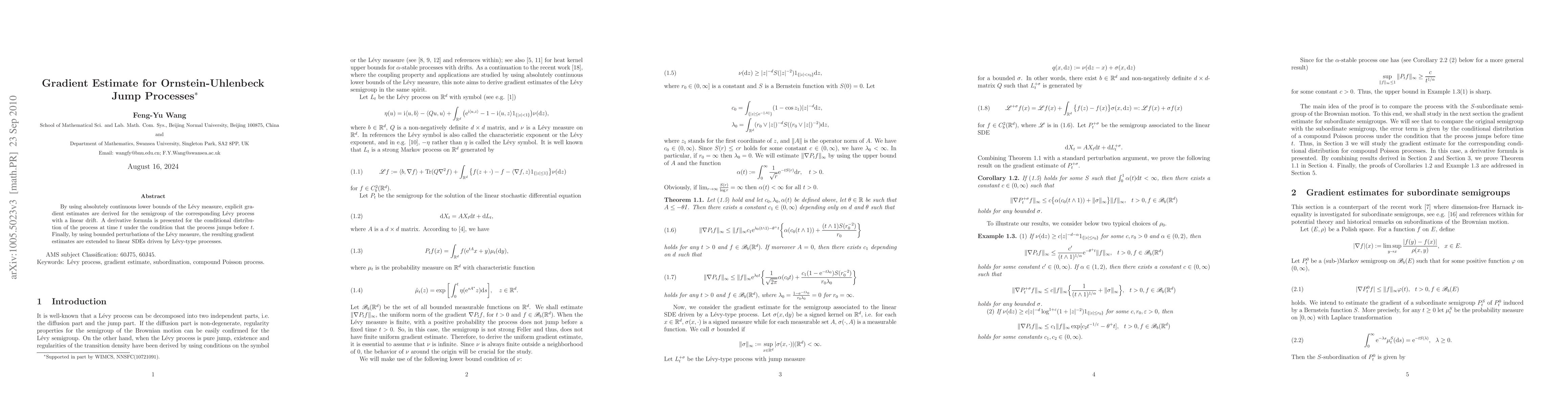 By using absolutely continuous lower bounds of the L\'evy measure, explicit gradient estimates are derived for the semigroup of the corresponding L\'evy process with a linear drift. A derivative formula is presented for the conditional distribution of the process at time $t$ under the condition that the process jumps before $t$. Finally, by using bounded perturbations of the L\'evy measure, the resulting gradient estimates are extended to linear SDEs driven by L\'evy-type processes.