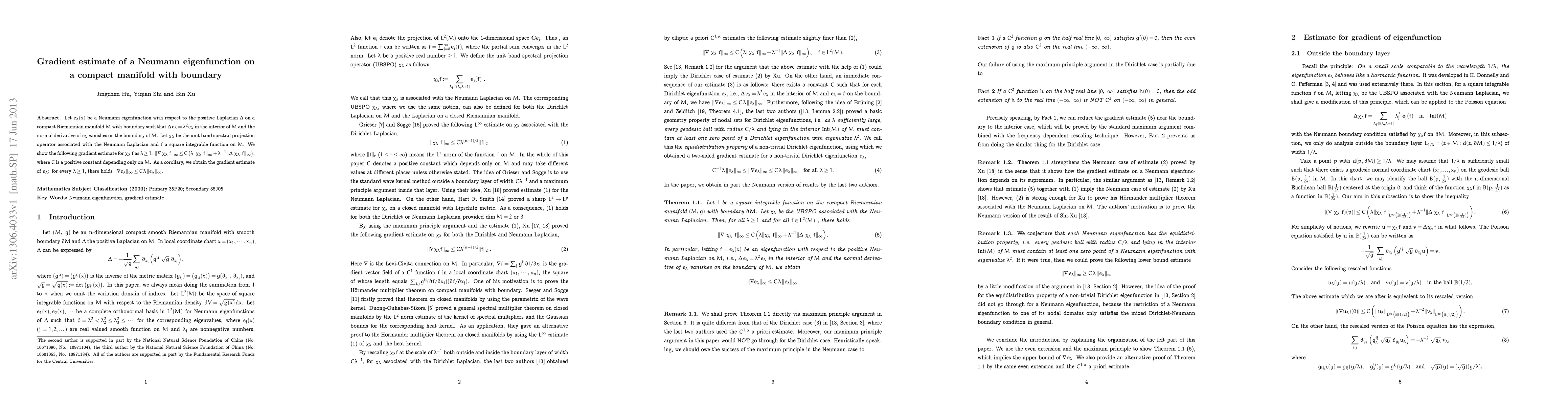Let $e_\l(x)$ be a Neumann eigenfunction with respect to the positive Laplacian $\Delta$ on a compact Riemannian manifold $M$ with boundary such that $\Delta\, e_\l=\l^2 e_\l$ in the interior of $M$ and the normal derivative of $e_\l$ vanishes on the boundary of $M$. Let $\chi_\lambda$ be the unit band spectral projection operator associated with the Neumann Laplacian and $f$ a square integrable function on $M$. We show the following gradient estimate for $\chi_\lambda\,f$ as $\lambda\geq 1$: $\|\nabla\ \chi_\l\ f\|_\infty\leq C\l \|\chi_\l\f\|_\infty+\l^{-1}\|\Delta\ \chi_\l\ f\|_\infty$, where $C$ is a positive constant depending only on $M$. As a corollary, we obtain the gradient estimate of $e_\l$: for every $\l\geq 1$, there holds $\|\nabla e_\l\|_\infty\leq C\,\l\, \|e_\l\|_\infty$.