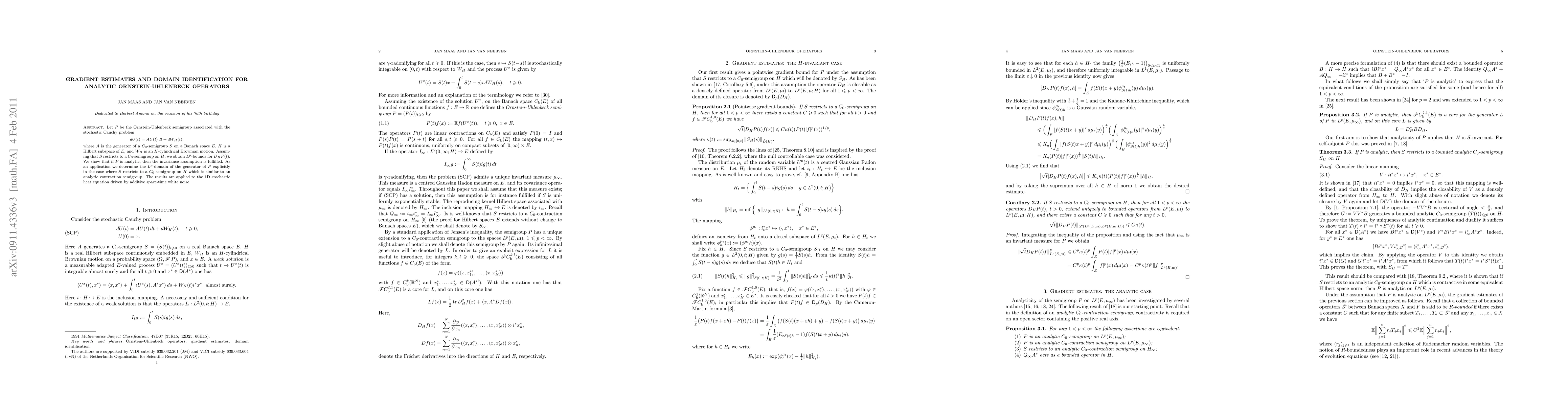 Let (P(t)) be the Ornstein-Uhlenbeck semigroup associated with the stochastic Cauchy problem dU(t) = AU(t)dt + dW_H(t), where A is the generator of a C_0-semigroup (S(t)) on a Banach space E, H is a Hilbert subspace of E, and (W_H(t)) is an H-cylindrical Brownian motion. Assuming that (S(t)) restricts to a C_0-semigroup on H, we obtain L^p-bounds for the gradient D_H P(t). We show that if (P(t)) is analytic, then the invariance assumption is fulfilled. As an application we determine the L^p-domain of the generator of (P(t)) explicitly in the case where (S(t)) restricts to a C_0-semigroup on H which is similar to an analytic contraction semigroup. The results are applied to the 1D stochastic heat equation driven by additive space-time white noise.