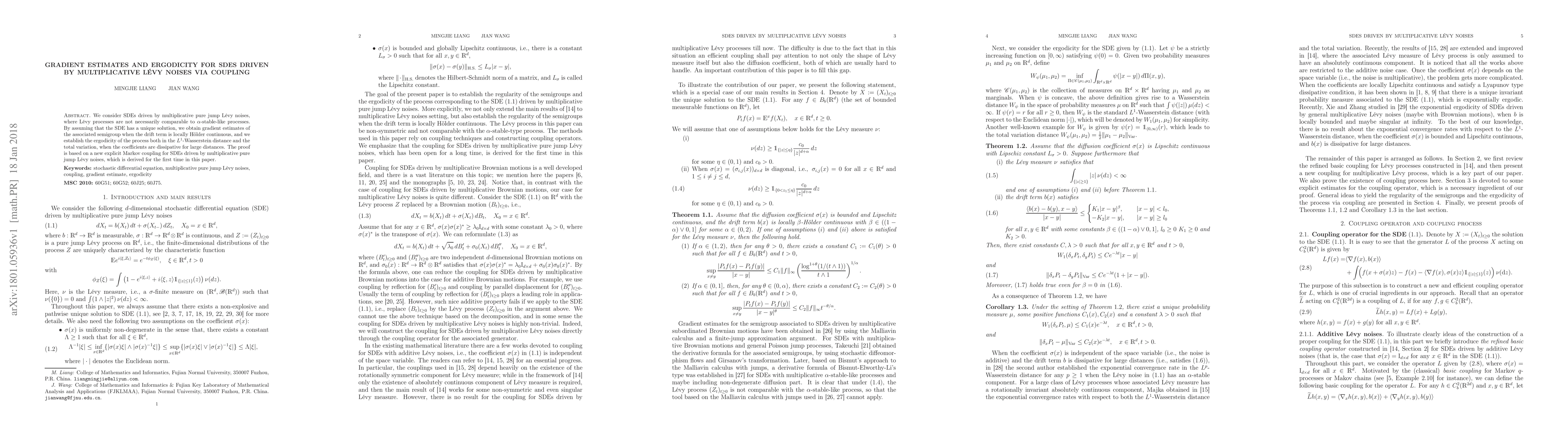 This paper provides gradient estimates for SDEs driven by multiplicative pure jump Lévy noises, assuming a unique solution. It establishes ergodicity in $L^1$-Wasserstein distance and total variation using a novel explicit Markov coupling method.