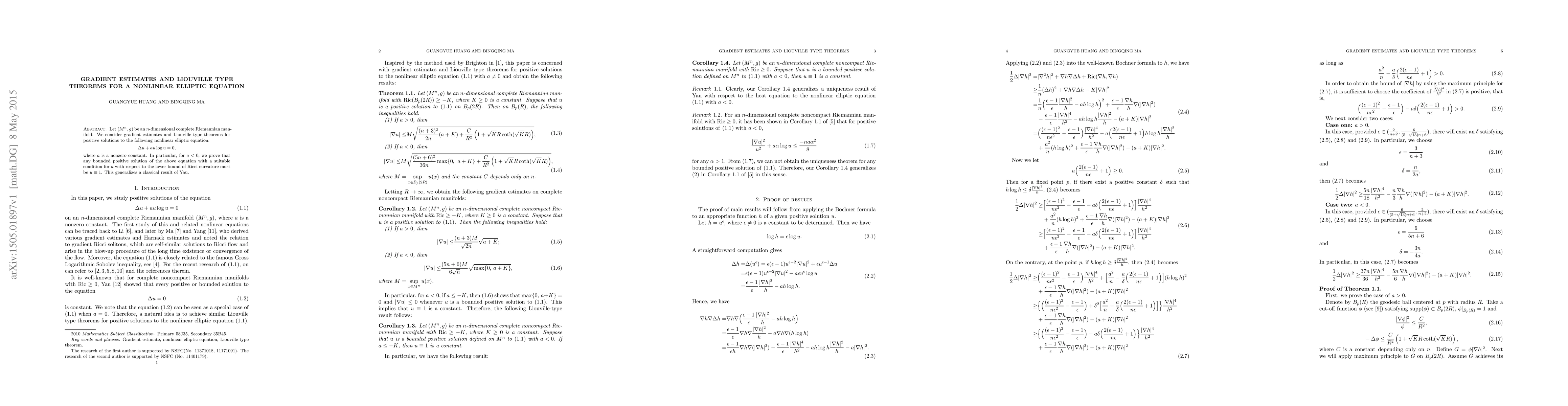 Let $(M^n,g)$ be an n-dimensional complete Riemannian manifold. We consider gradient estimates and Liouville type theorems for positive solutions to the following nonlinear elliptic equation: $$\Delta u+au\log u=0,$$ where $a$ is a nonzero constant. In particular, for $a<0$, we prove that any bounded positive solution of the above equation with a suitable condition for $a$ with respect to the lower bound of Ricci curvature must be $u\equiv 1$. This generalizes a classical result of Yau.