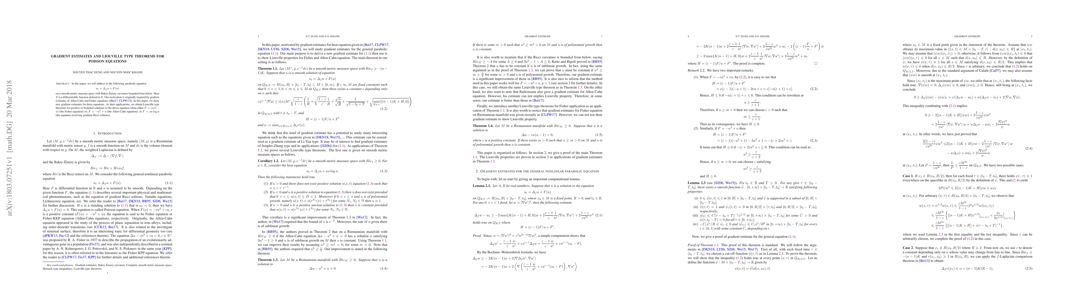 This paper presents new gradient estimates for the parabolic equation $u_t=\Delta_fu + F(u)$ on smooth metric measure spaces with Bakry-Émery curvature bounds. The results apply to Liouville type theorems for positive or bounded solutions when $F$ corresponds to the Fisher, Allen-Cahn, or gradient Ricci solitons equations.