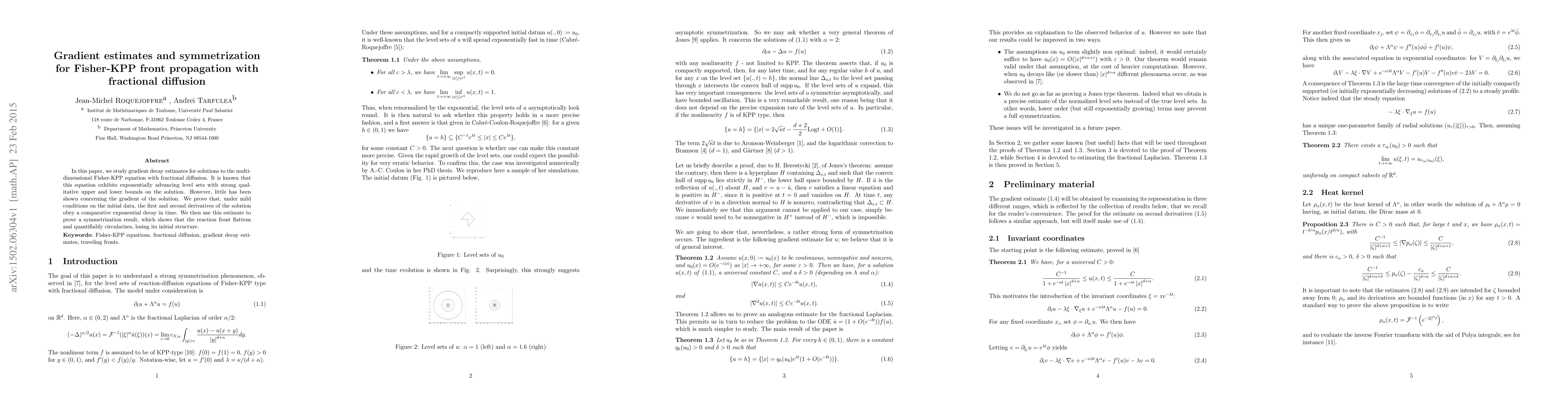 This paper investigates gradient decay estimates for solutions to the multi-dimensional Fisher-KPP equation with fractional diffusion, proving exponential decay in the first and second derivatives. It further demonstrates a symmetrization result showing that the reaction front flattens and circularizes over time.