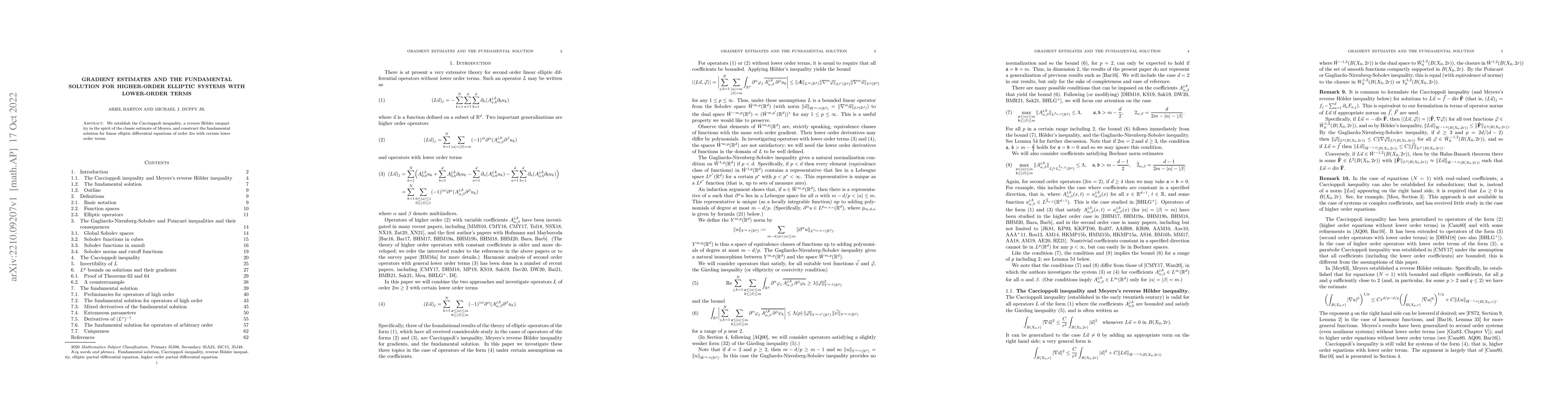 We establish the Caccioppoli inequality, a reverse H\"older inequality in the spirit of the classic estimate of Meyers, and construct the fundamental solution for linear elliptic differential equations of order $2m$ with certain lower order terms.