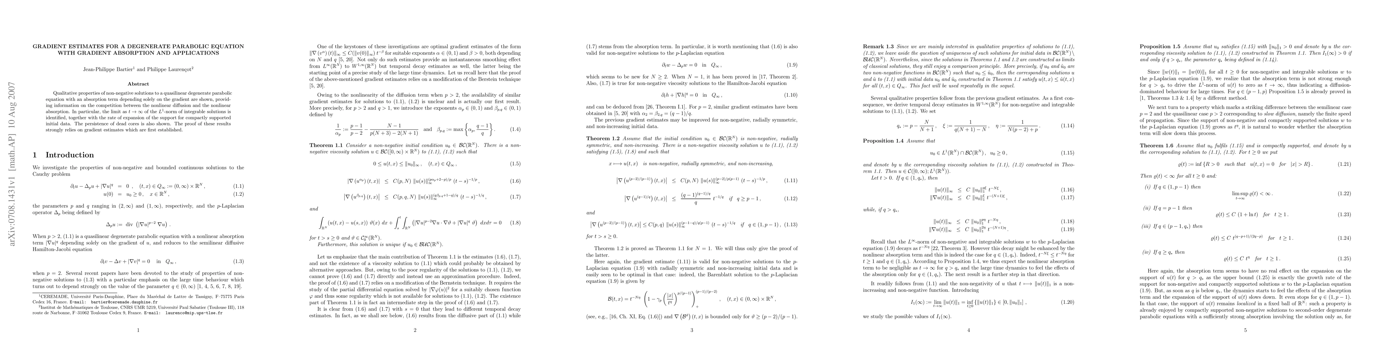 This paper establishes gradient estimates for non-negative solutions to a quasilinear degenerate parabolic equation featuring gradient-dependent absorption, revealing the interplay between diffusion and absorption. The study identifies the long-term mass behavior of integrable solutions and the expansion rate of the support, along with the persistence of dead cores.
