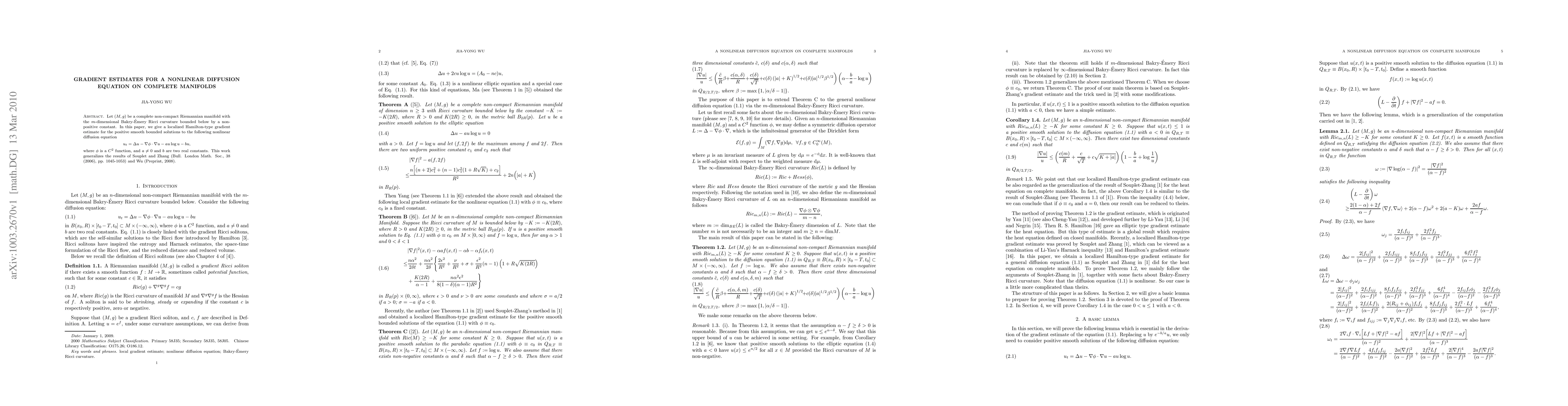 This paper presents a localized gradient estimate for positive smooth solutions to a nonlinear diffusion equation on complete non-compact Riemannian manifolds with non-positive Bakry-Émery Ricci curvature bounds. The results generalize previous findings by Souplet and Zhang, as well as Wu.