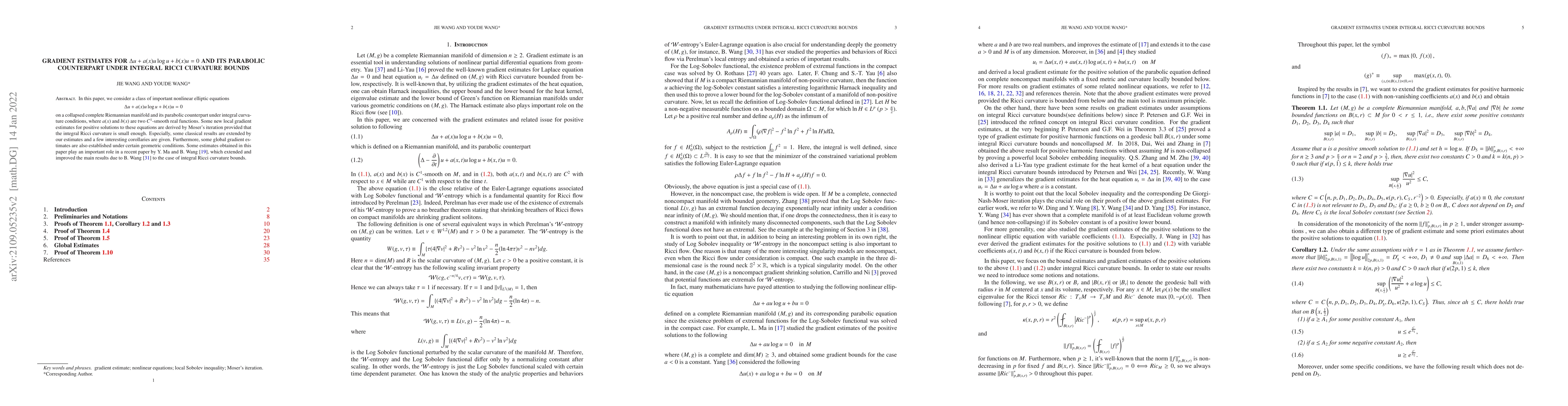 In this paper, we consider a class of important nonlinear elliptic equations $$\Delta u + a(x)u\log u + b(x)u = 0$$ on a collapsed complete Riemannian manifold and its parabolic counterpart under integral curvature conditions, where $a(x)$ and $b(x)$ are two $C^1$-smooth real functions. Some new local gradient estimates for positive solutions to these equations are derived by Moser's iteration provided that the integral Ricci curvature is small enough. Especially, some classical results are extended by our estimates and a few interesting corollaries are given. Furthermore, some global gradient estimates are also established under certain geometric conditions. Some estimates obtained in this paper play an important role in a recent paper by Y. Ma and B. Wang [17], which extended and improved the main results due to B. Wang [29] to the case of integral Ricci curvature bounds.