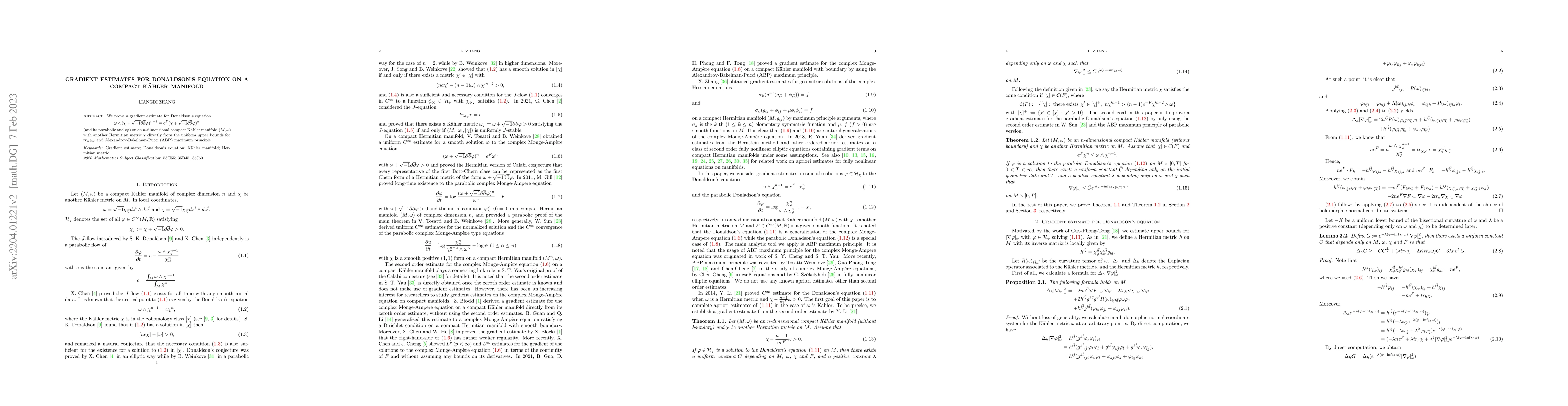 This paper establishes a gradient estimate for Donaldson's equation on a compact Kähler manifold, deriving it from uniform upper bounds for a specific trace and the Alexandrov-Bakelman-Pucci maximum principle. The result applies to both the equation and its parabolic analog.