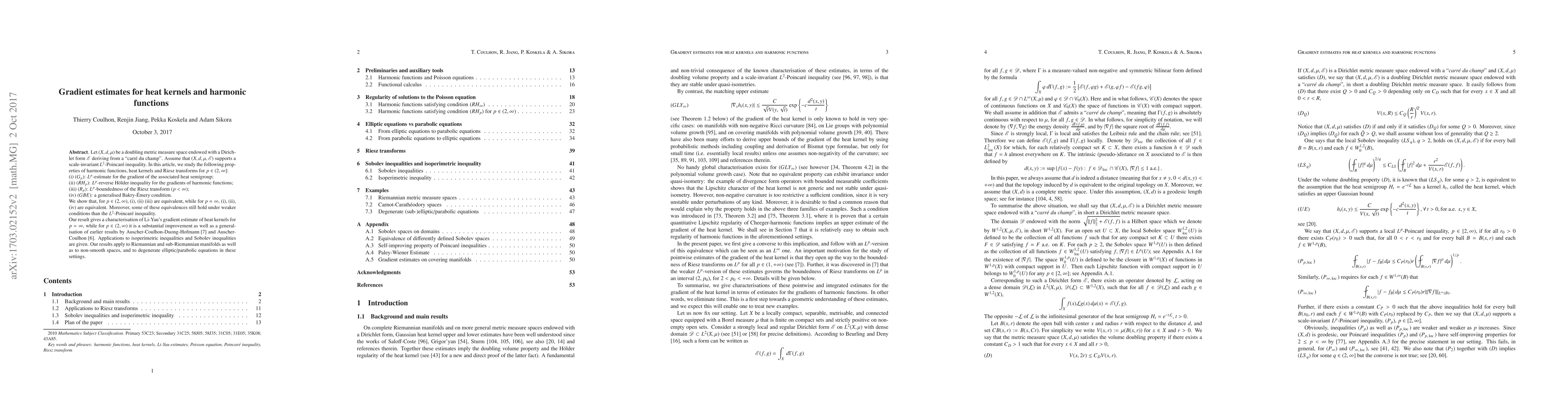 Let $(X,d,\mu)$ be a doubling metric measure space endowed with a Dirichlet form $\E$ deriving from a "carr\'e du champ". Assume that $(X,d,\mu,\E)$ supports a scale-invariant $L^2$-Poincar\'e inequality. In this article, we study the following properties of harmonic functions, heat kernels and Riesz transforms for $p\in (2,\infty]$: (i) $(G_p)$: $L^p$-estimate for the gradient of the associated heat semigroup; (ii) $(RH_p)$: $L^p$-reverse H\"older inequality for the gradients of harmonic functions; (iii) $(R_p)$: $L^p$-boundedness of the Riesz transform ($p<\infty$); (iv) $(GBE)$: a generalised Bakry-\'Emery condition. We show that, for $p\in (2,\infty)$, (i), (ii) (iii) are equivalent, while for $p=\infty$, (i), (ii), (iv) are equivalent. Moreover, some of these equivalences still hold under weaker conditions than the $L^2$-Poincar\'e inequality. Our result gives a characterisation of Li-Yau's gradient estimate of heat kernels for $p=\infty$, while for $p\in (2,\infty)$ it is a substantial improvement as well as a generalisation of earlier results by Auscher-Coulhon-Duong-Hofmann [7] and Auscher-Coulhon [6]. Applications to isoperimetric inequalities and Sobolev inequalities are given. Our results apply to Riemannian and sub-Riemannian manifolds as well as to non-smooth spaces, and to degenerate elliptic/parabolic equations in these settings.