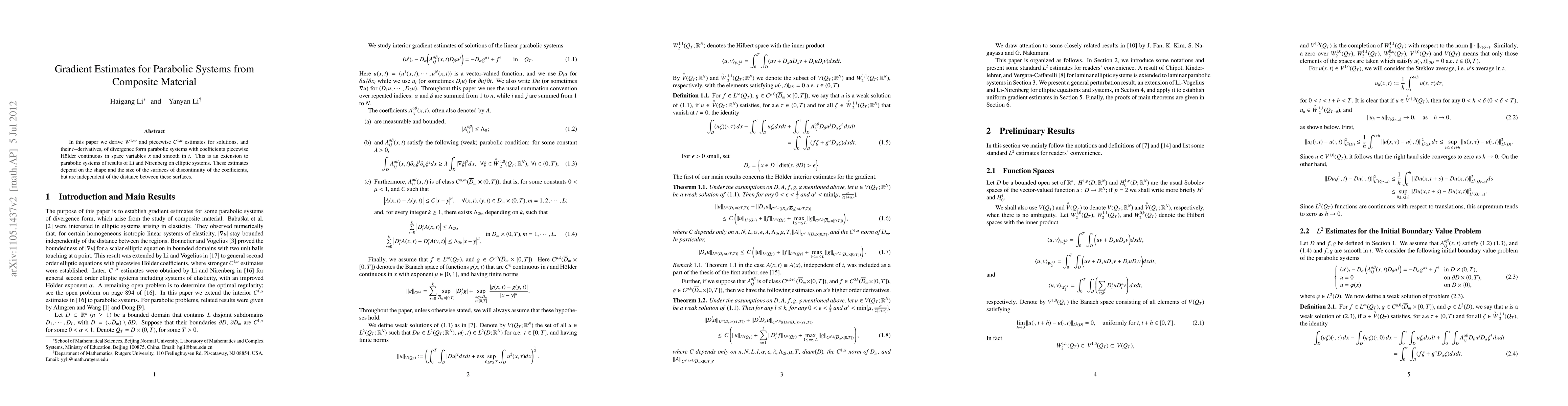 In this paper we derive $W^{1,\infty}$ and piecewise $C^{1,\alpha}$ estimates for solutions, and their $t-$derivatives, of divergence form parabolic systems with coefficients piecewise H\"older continuous in space variables $x$ and smooth in $t$. This is an extension to parabolic systems of results of Li and Nirenberg on elliptic systems. These estimates depend on the shape and the size of the surfaces of discontinuity of the coefficients, but are independent of the distance between these surfaces.