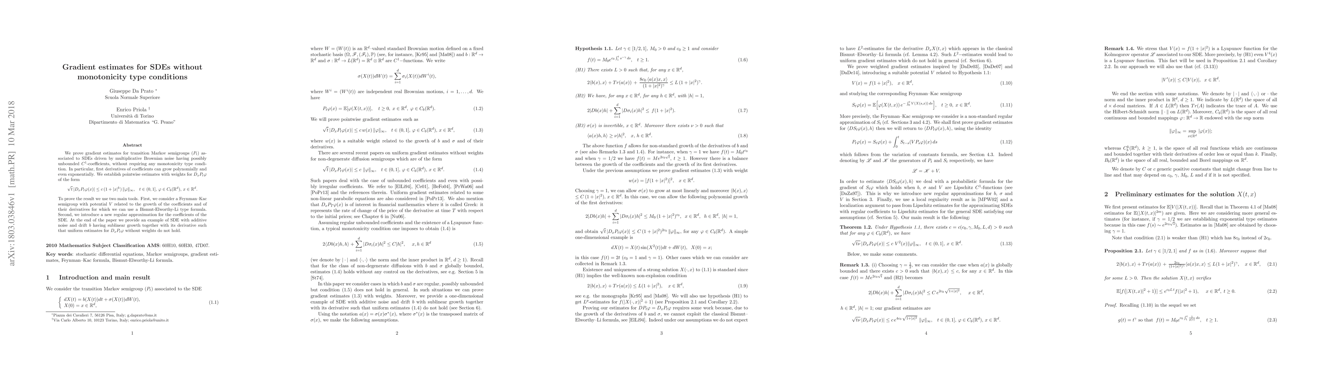 This paper proves gradient estimates for transition Markov semigroups associated with SDEs driven by multiplicative Brownian noise without monotonicity conditions, using a Feynman-Kac semigroup and a new regular approximation method. The estimates are given with weights and show that first derivatives of coefficients can grow polynomially or exponentially.