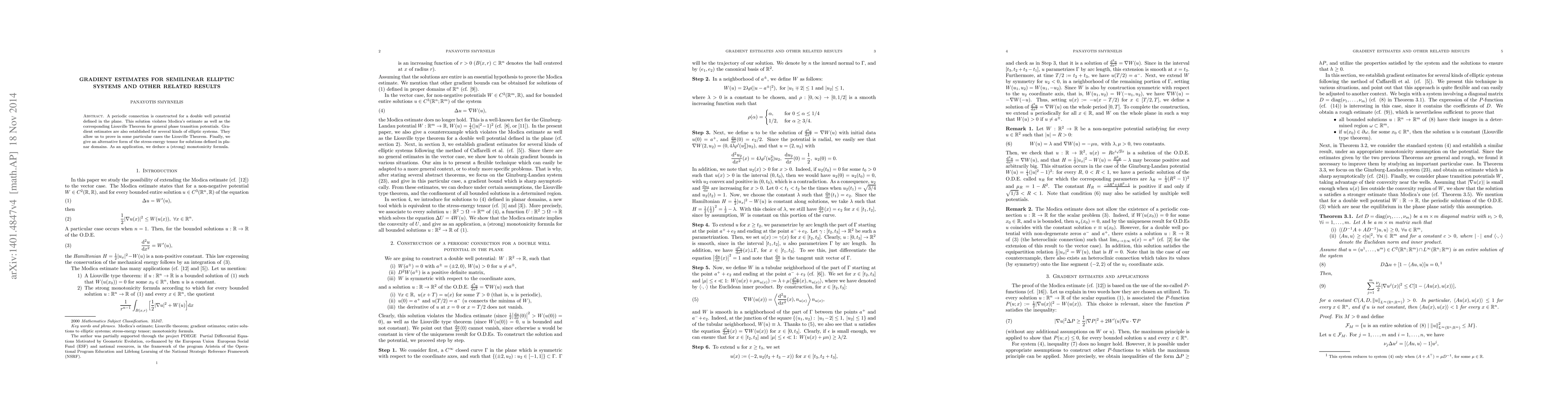 A periodic connection is constructed for a double well potential defined in the plane. This solution violates Modica's estimate as well as the corresponding Liouville Theorem for general phase transition potentials. Gradient estimates are also established for several kinds of elliptic systems. They allow us to prove in some particular cases the Liouville Theorem. Finally, we give an alternative form of the stress-energy tensor for solutions defined in planar domains. As an application, we deduce a (strong) monotonicity formula.