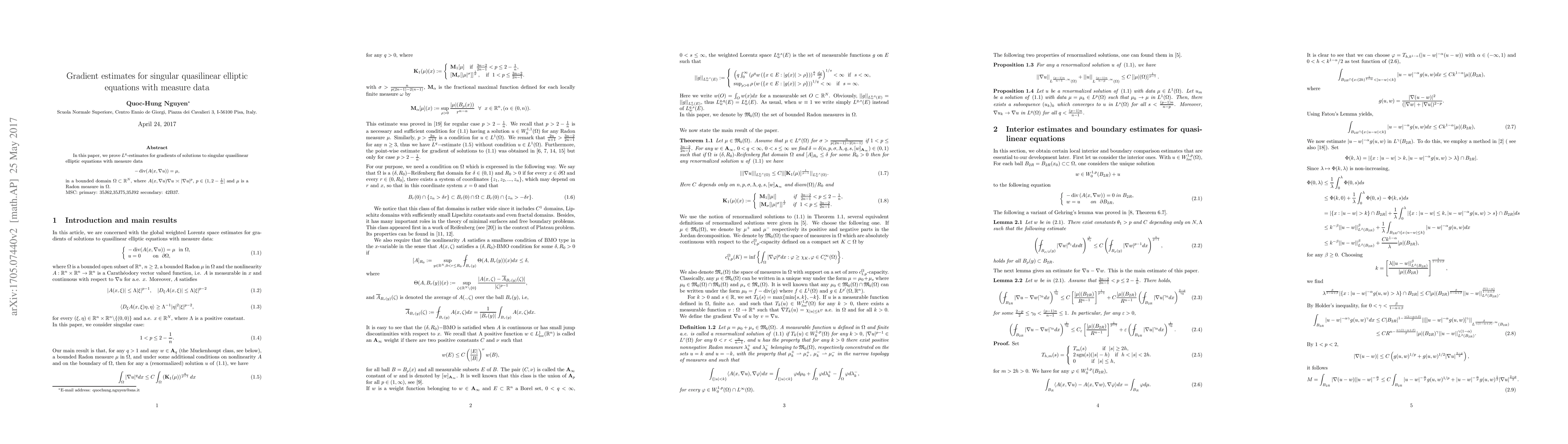 In this paper, we prove $L^q$-estimates for gradients of solutions to singular quasilinear elliptic equations with measure data $$-\operatorname{div}(A(x,\nabla u))=\mu,$$ in a bounded domain $\Omega\subset\mathbb{R}^{N}$, where $A(x,\nabla u)\nabla u \asymp |\nabla u|^p$, $p\in (1,2-\frac{1}{n}]$ and $\mu$ is a Radon measure in $\Omega$