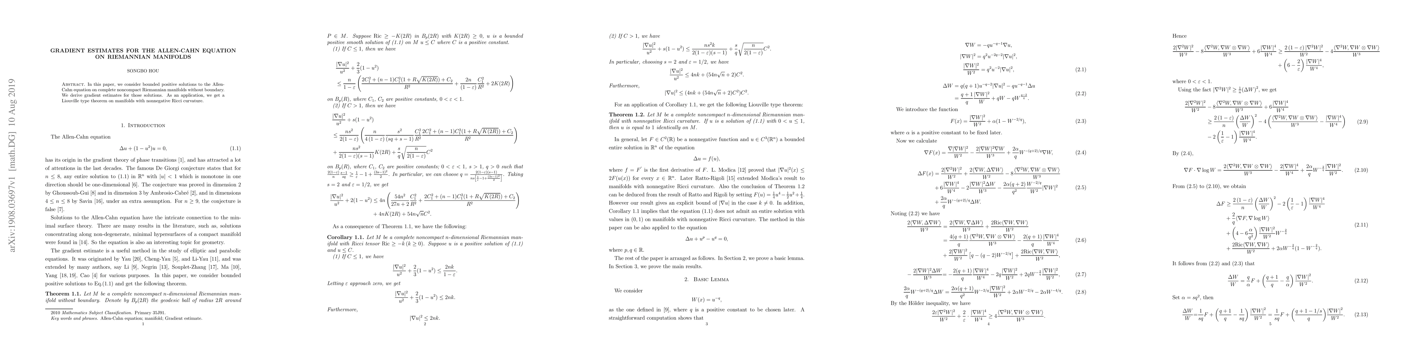 This paper derives gradient estimates for bounded positive solutions to the Allen-Cahn equation on complete noncompact Riemannian manifolds, leading to a Liouville type theorem for manifolds with nonnegative Ricci curvature.