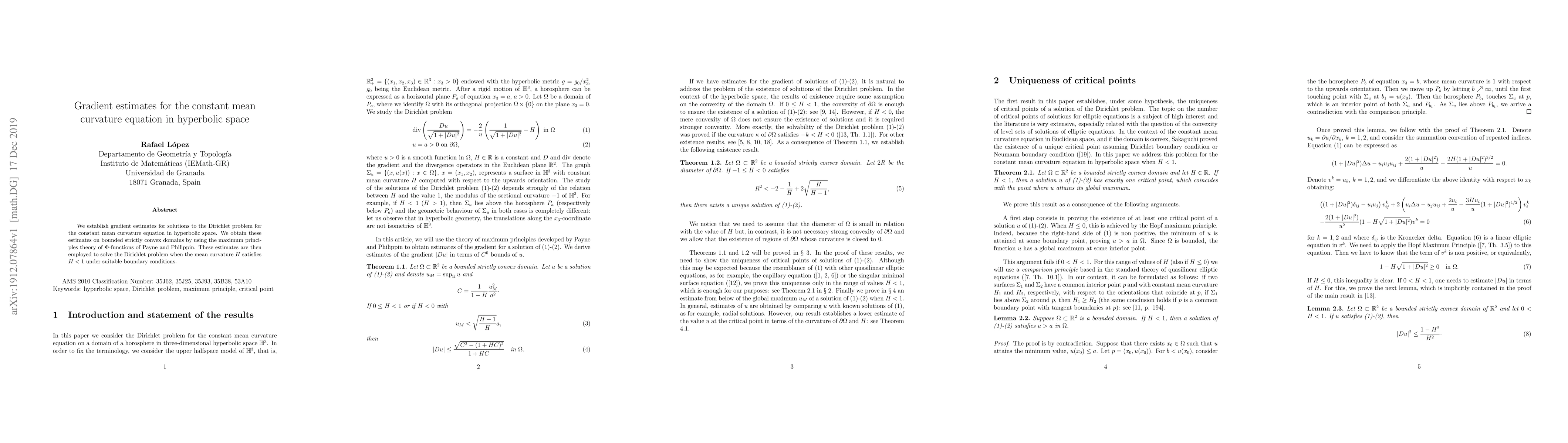 This paper establishes gradient estimates for solutions to the constant mean curvature equation in hyperbolic space, utilizing maximum principles and $\Phi$-functions. These estimates are applied to solve the Dirichlet problem for mean curvature under the condition $H<1$, given suitable boundary conditions.