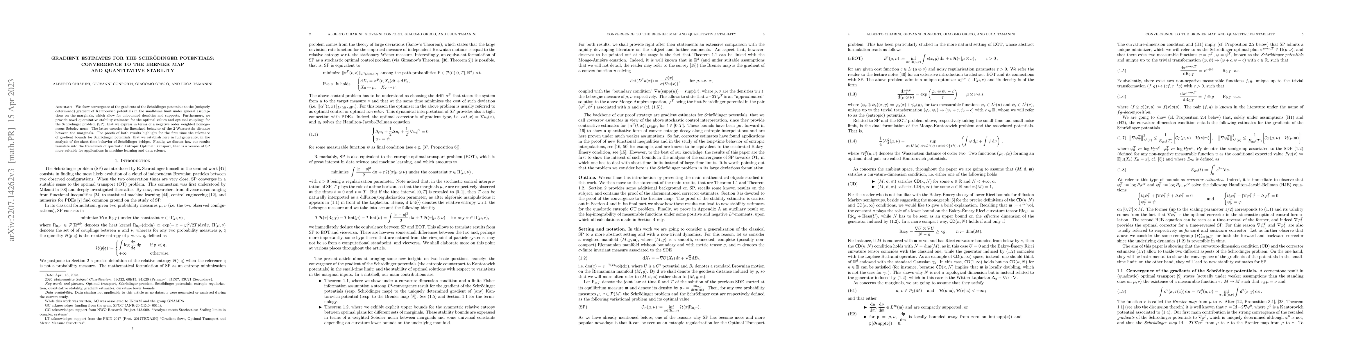 The paper demonstrates the convergence of gradients of Schrödinger potentials to the Brenier map in the small-time limit, under general conditions allowing for unbounded densities. It also provides quantitative stability estimates for the optimal values and couplings in the Schrödinger problem, expressed via a negative order weighted homogeneous Sobolev norm, and discusses implications for quadratic Entropic Optimal Transport relevant to machine learning.