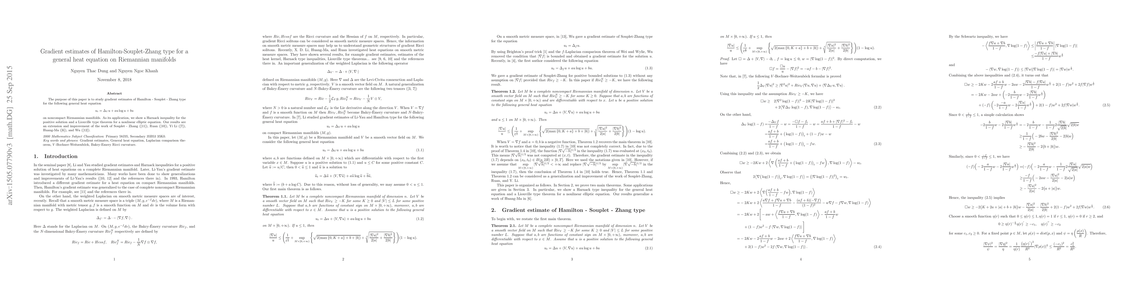 The purpose of this paper is to study gradient estimate of Hamilton - Souplet - Zhang type for the general heat equation $$ u_t=\Delta_V u + au\log u+bu $$ on noncompact Riemannian manifolds. As its application, we show a Harnak inequality for the heat solution and a Liouville type theorem for a nonlinear elliptic equation. Our results are an extention and improvement of the work of Souplet - Zhang (\cite{SZ}), Ruan (\cite{Ruan}), Yi Li (\cite{Yili}) and Huang-Ma (\cite{HM}).