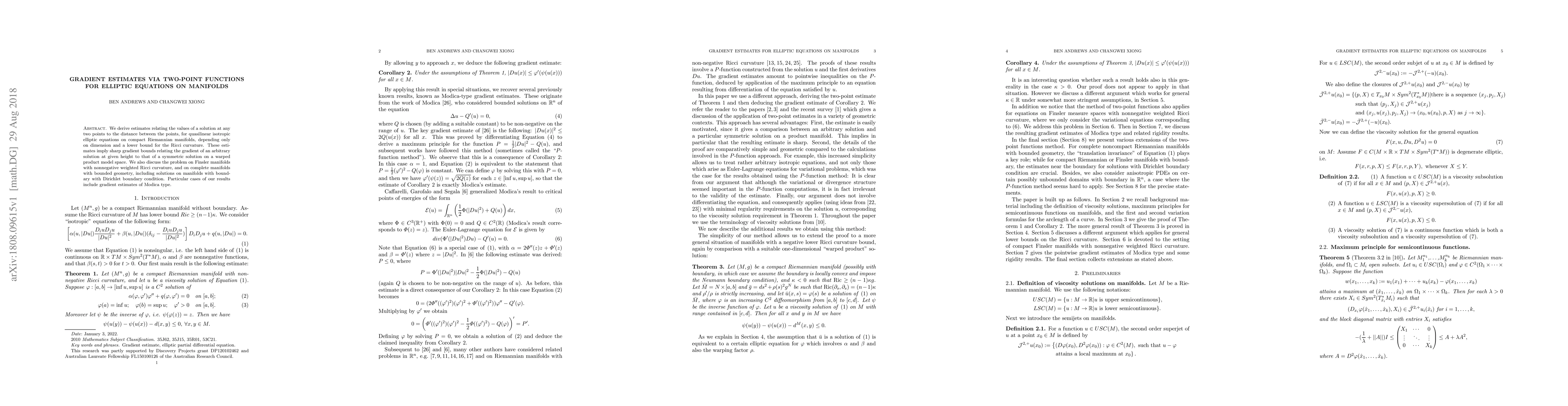 We derive estimates relating the values of a solution at any two points to the distance between the points, for quasilinear isotropic elliptic equations on compact Riemannian manifolds, depending only on dimension and a lower bound for the Ricci curvature. These estimates imply sharp gradient bounds relating the gradient of an arbitrary solution at given height to that of a symmetric solution on a warped product model space. We also discuss the problem on Finsler manifolds with nonnegative weighted Ricci curvature, and on complete manifolds with bounded geometry, including solutions on manifolds with boundary with Dirichlet boundary condition. Particular cases of our results include gradient estimates of Modica type.