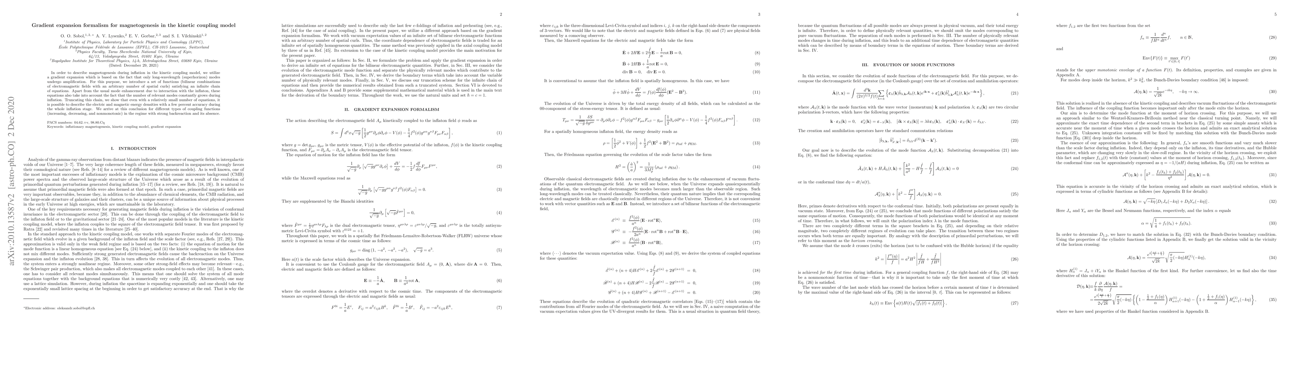 In order to describe magnetogenesis during inflation in the kinetic coupling model, we utilize a gradient expansion which is based on the fact that only long-wavelength (superhorizon) modes undergo amplification. For this purpose, we introduce a set of functions (bilinear combinations of electromagnetic fields with an arbitrary number of spatial curls) satisfying an infinite chain of equations. Apart from the usual mode enhancement due to interaction with the inflaton, these equations also take into account the fact that the number of relevant modes constantly grows during inflation. Truncating this chain, we show that even with a relatively small number of equations, it is possible to describe the electric and magnetic energy densities with a few percent accuracy during the whole inflation stage. We arrive at this conclusion for different types of coupling functions (increasing, decreasing, and nonmonotonic) in the regime with strong backreaction and its absence.