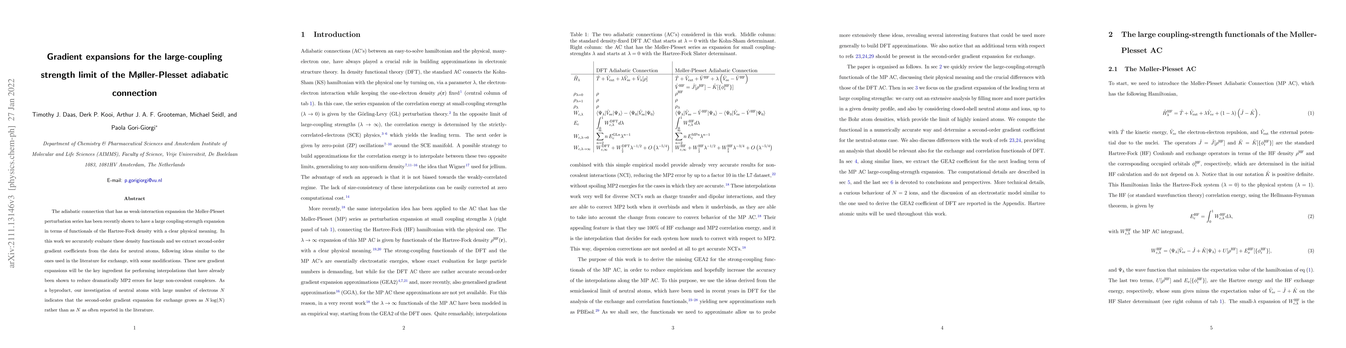 This paper evaluates density functionals for the large-coupling strength limit of the M{\o}ller-Plesset adiabatic connection, extracting second-order gradient coefficients for neutral atoms. These new gradient expansions are crucial for reducing MP2 errors in large non-covalent complexes, and the study reveals that the second-order gradient expansion for exchange scales as $N\log(N)$ rather than $N$.
