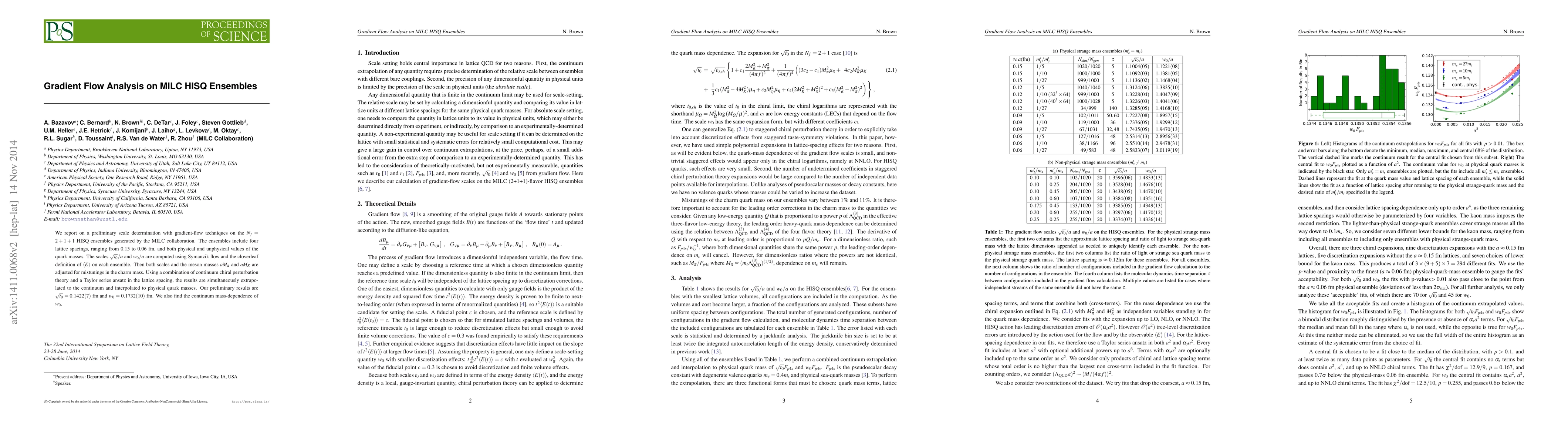 This paper presents preliminary scale determinations using gradient-flow techniques on MILC HISQ ensembles, extrapolating results to the continuum and physical quark masses. The computed scales are $\sqrt{t_0} = 0.1422(7)$ fm and $w_0 = 0.1732(10)$ fm.