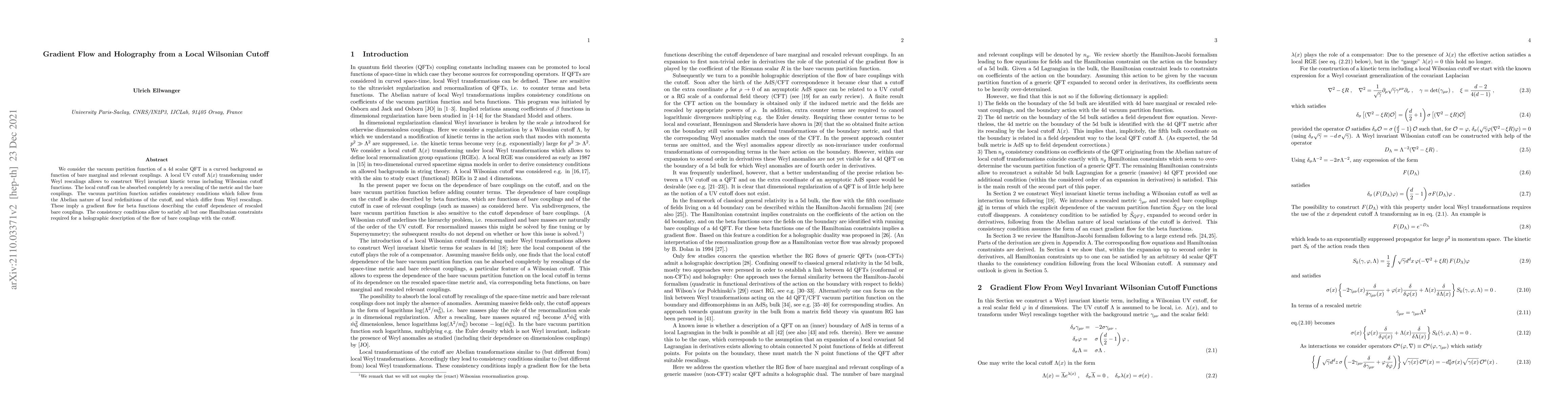 This paper explores the vacuum partition function of a 4d scalar QFT under local UV cutoffs that respect Weyl rescalings, leading to Weyl invariant kinetic terms. The study reveals a gradient flow for beta functions and nearly satisfies all Hamiltonian constraints necessary for a holographic description of the flow of rescaled bare couplings.