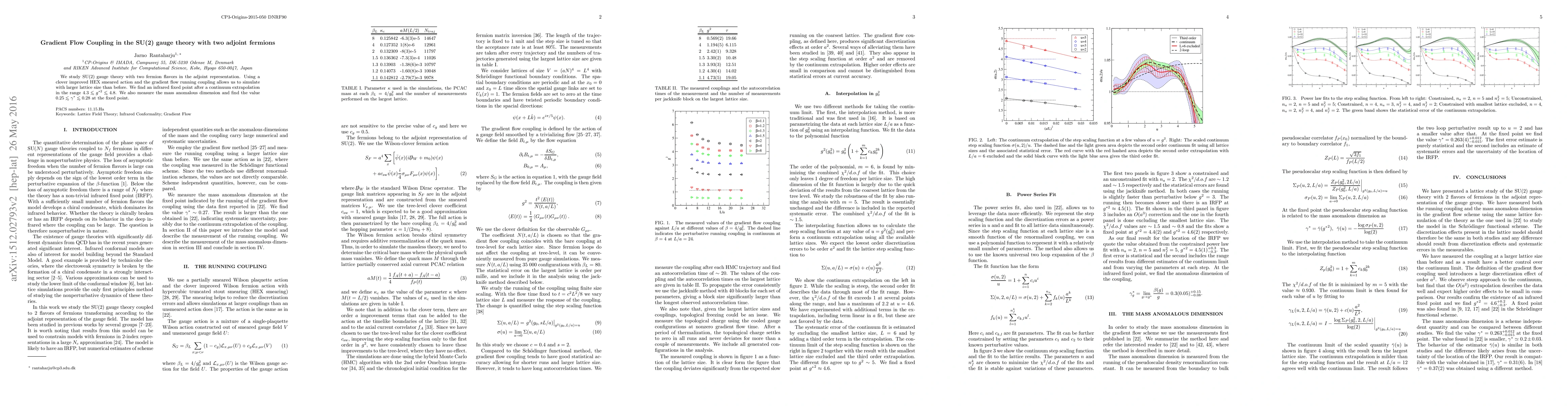We study SU(2) gauge theory with two fermion flavors in the adjoint representation. Using a clover improved HEX smeared action and the gradient flow running coupling allows us to simulate with larger lattice size than before. We find an infrared fixed point after a continuum extrapolation in the range $4.5 \lesssim g^{*2} \lesssim 5$. We also measure the mass anomalous dimension and find the value $ 0.25 \lesssim \gamma^* \lesssim 0.28 $ at the fixed point.