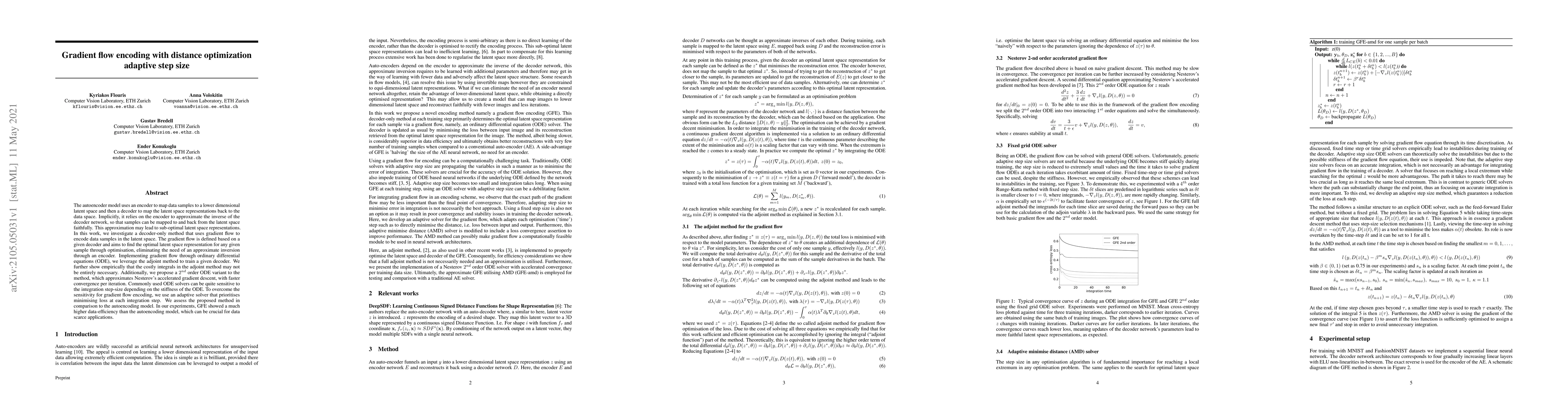 The autoencoder model uses an encoder to map data samples to a lower dimensional latent space and then a decoder to map the latent space representations back to the data space. Implicitly, it relies on the encoder to approximate the inverse of the decoder network, so that samples can be mapped to and back from the latent space faithfully. This approximation may lead to sub-optimal latent space representations. In this work, we investigate a decoder-only method that uses gradient flow to encode data samples in the latent space. The gradient flow is defined based on a given decoder and aims to find the optimal latent space representation for any given sample through optimisation, eliminating the need of an approximate inversion through an encoder. Implementing gradient flow through ordinary differential equations (ODE), we leverage the adjoint method to train a given decoder. We further show empirically that the costly integrals in the adjoint method may not be entirely necessary. Additionally, we propose a $2^{nd}$ order ODE variant to the method, which approximates Nesterov's accelerated gradient descent, with faster convergence per iteration. Commonly used ODE solvers can be quite sensitive to the integration step-size depending on the stiffness of the ODE. To overcome the sensitivity for gradient flow encoding, we use an adaptive solver that prioritises minimising loss at each integration step. We assess the proposed method in comparison to the autoencoding model. In our experiments, GFE showed a much higher data-efficiency than the autoencoding model, which can be crucial for data scarce applications.