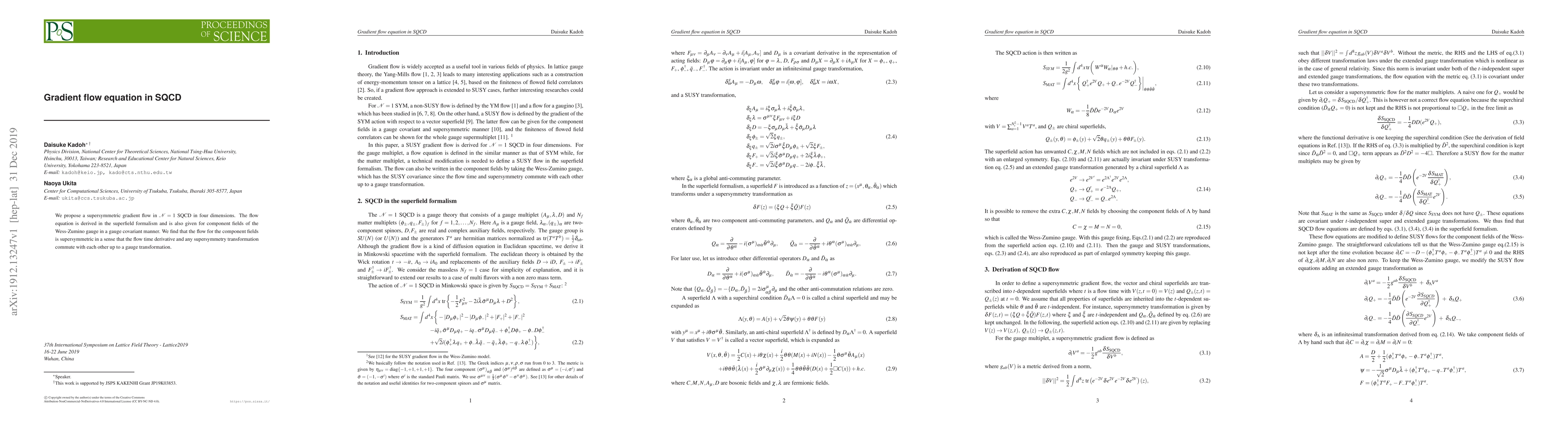 This paper proposes a supersymmetric gradient flow equation in ${\cal N}=1$ SQCD in four dimensions, derived in the superfield formalism and expressed for component fields in a gauge covariant manner. The flow is shown to be supersymmetric, with the flow time derivative commuting with supersymmetry transformations, up to a gauge transformation.