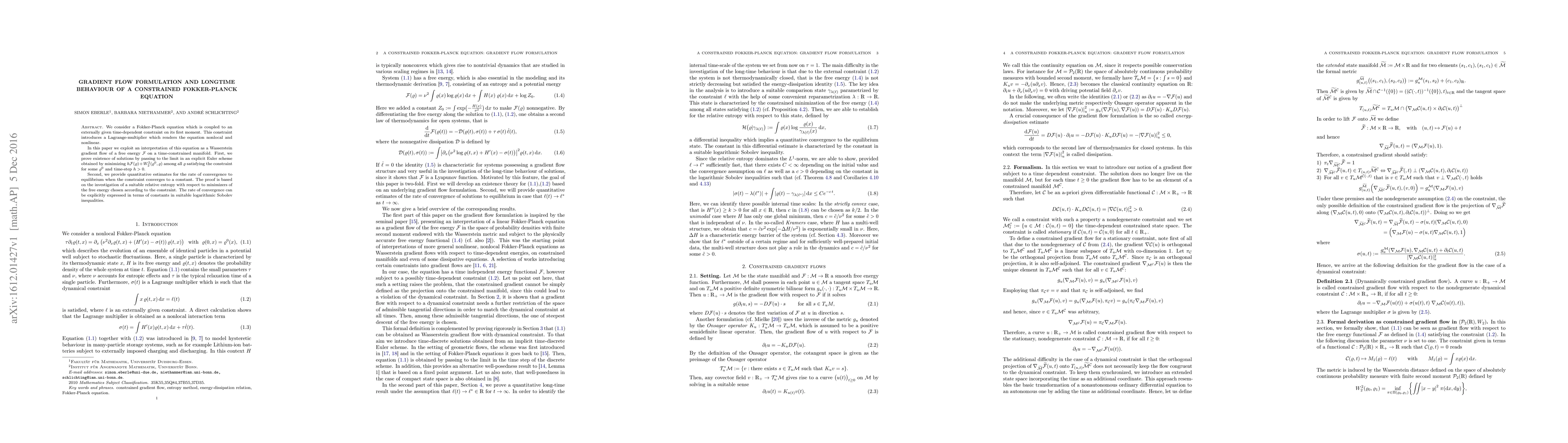 We consider a Fokker-Planck equation which is coupled to an externally given time-dependent constraint on its first moment. This constraint introduces a Lagrange-multiplier which renders the equation nonlocal and nonlinear. In this paper we exploit an interpretation of this equation as a Wasserstein gradient flow of a free energy ${\mathcal{F}}$ on a time-constrained manifold. First, we prove existence of solutions by passing to the limit in an explicit Euler scheme obtained by minimizing $h {\mathcal{F}}(\varrho)+W_2^2(\varrho^0,\varrho)$ among all $\varrho$ satisfying the constraint for some $\varrho^0$ and time-step $h>0$. Second, we provide quantitative estimates for the rate of convergence to equilibrium when the constraint converges to a constant. The proof is based on the investigation of a suitable relative entropy with respect to minimizers of the free energy chosen according to the constraint. The rate of convergence can be explicitly expressed in terms of constants in suitable logarithmic Sobolev inequalities.