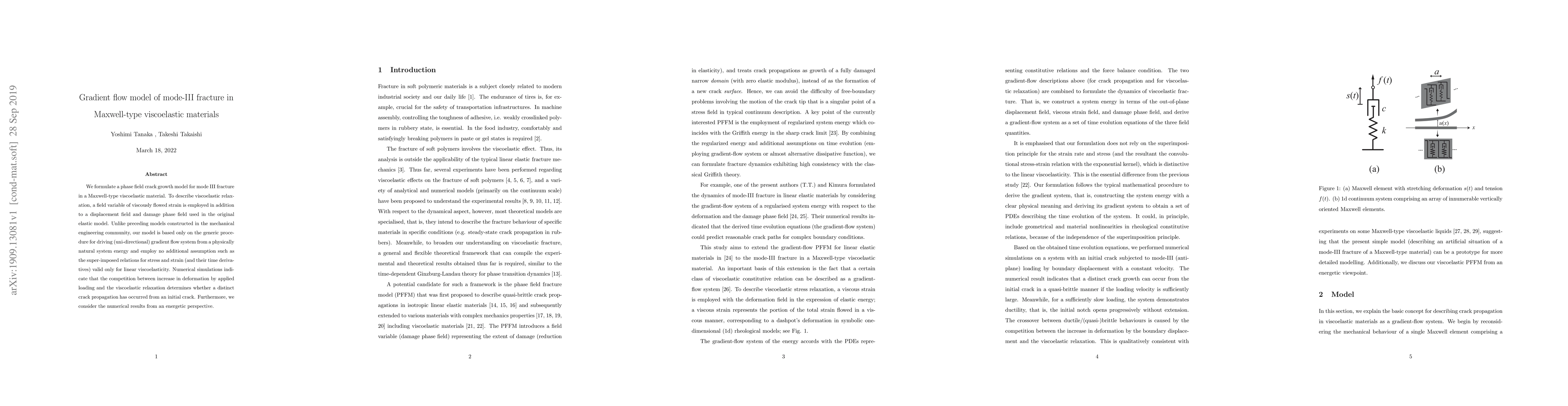 We formulate a phase field crack growth model for mode III fracture in a Maxwell-type viscoelastic material. To describe viscoelastic relaxation, a field variable of viscously flowed strain is employed in addition to a displacement field and damage phase field used in the original elastic model. Unlike preceding models constructed in the mechanical engineering community, our model is based only on the generic procedure for driving (uni-directional) gradient flow system from a physically natural system energy and employ no additional assumption such as the super-imposed relations for stress and strain (and their time derivatives) valid only for linear viscoelasticity. Numerical simulations indicate that the competition between increase in deformation by applied loading and the viscoelastic relaxation determines whether a distinct crack propagation has occurred from an initial crack. Furthermore, we consider the numerical results from an energetic perspective.